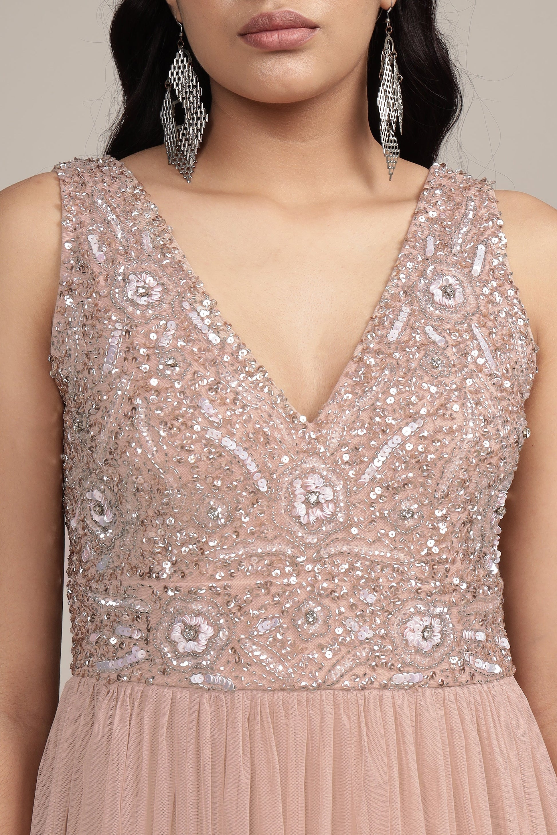 Lace & Beads Addie Embellished Maxi Dress in Taupe. Turn heads in the Addie Maxi Dress, a dreamy blend of elegance and sparkle. The fitted bodice, adorned with intricate embellishments, shimmers beautifully under the light, creating a captivating effect for evening occasions. The V-neckline and sleeveless design create a sleek, sophisticated silhouette, while the flowing taupe mesh skirt brings effortless grace. Perfect for formal events and special celebrations, the Addie Maxi ensures you’ll shine all night long.