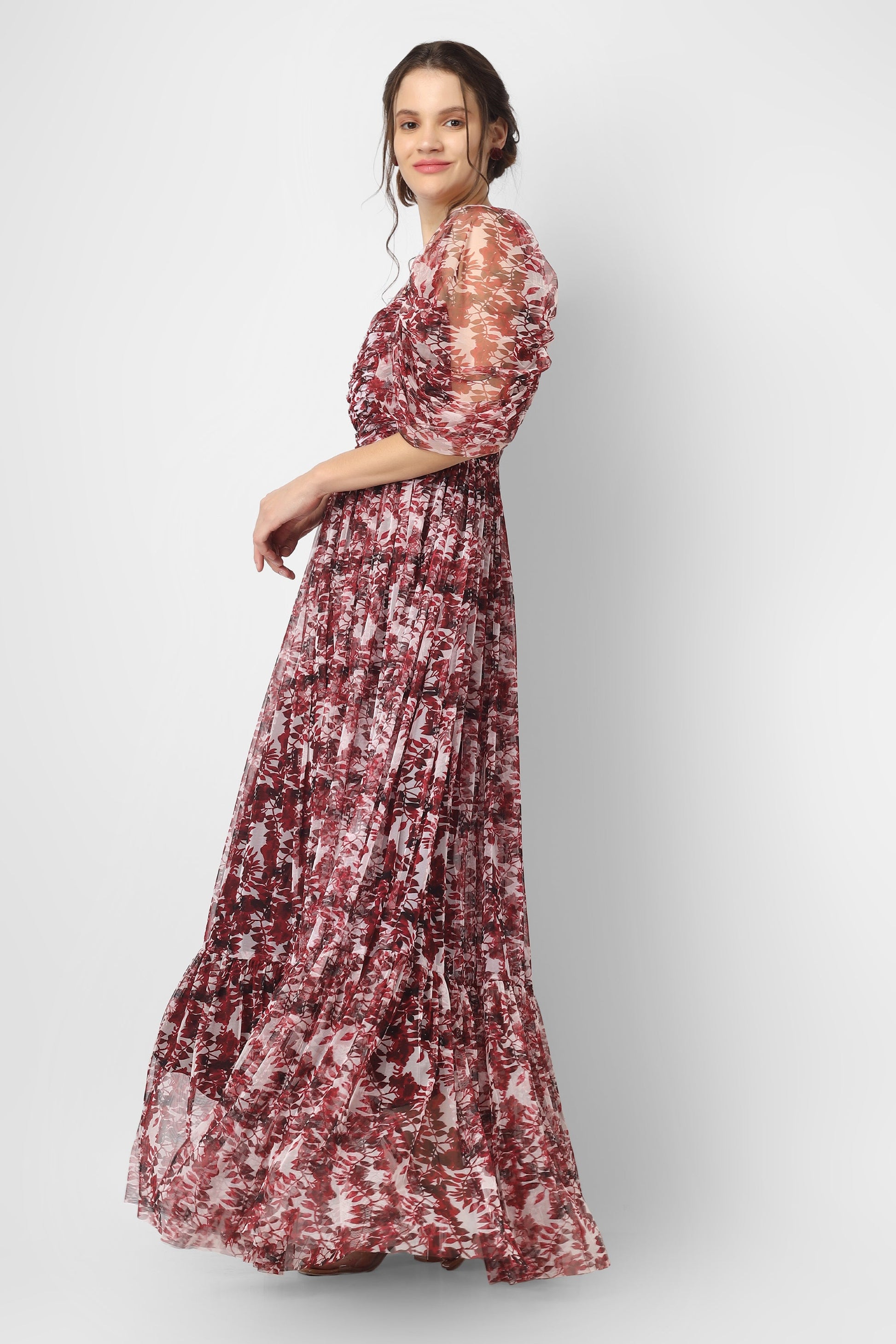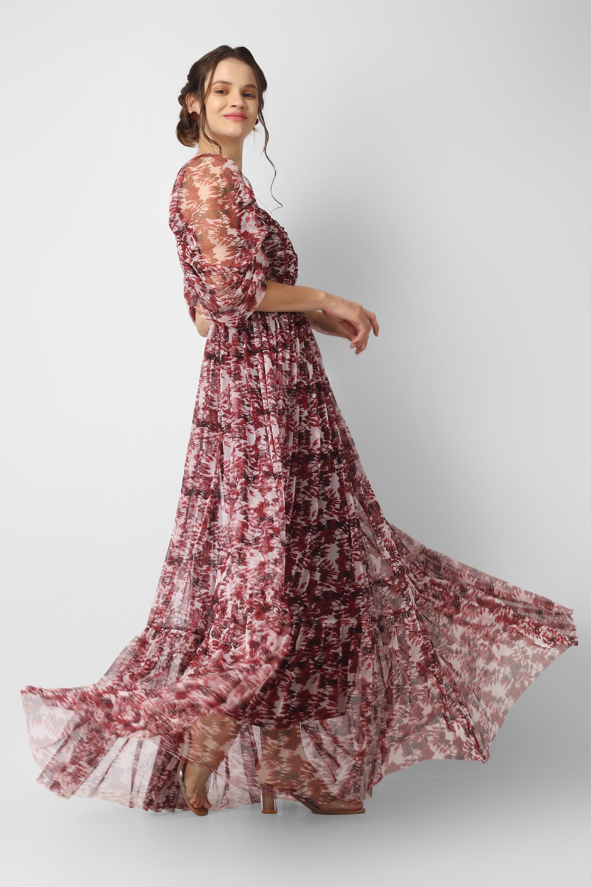 Lace & Beads Alicia Maxi in Burgundy Print. This dress is a beautiful blend of autumnal colors and flowing elegance, perfect for seasonal events. With its rich burgundy floral print, ruched bodice, and delicate sheer sleeves, this piece offers a romantic style. The crisscross straps and full, pleated skirt add dimension, making it an ideal choice for evening occasions where you want to make a statement.