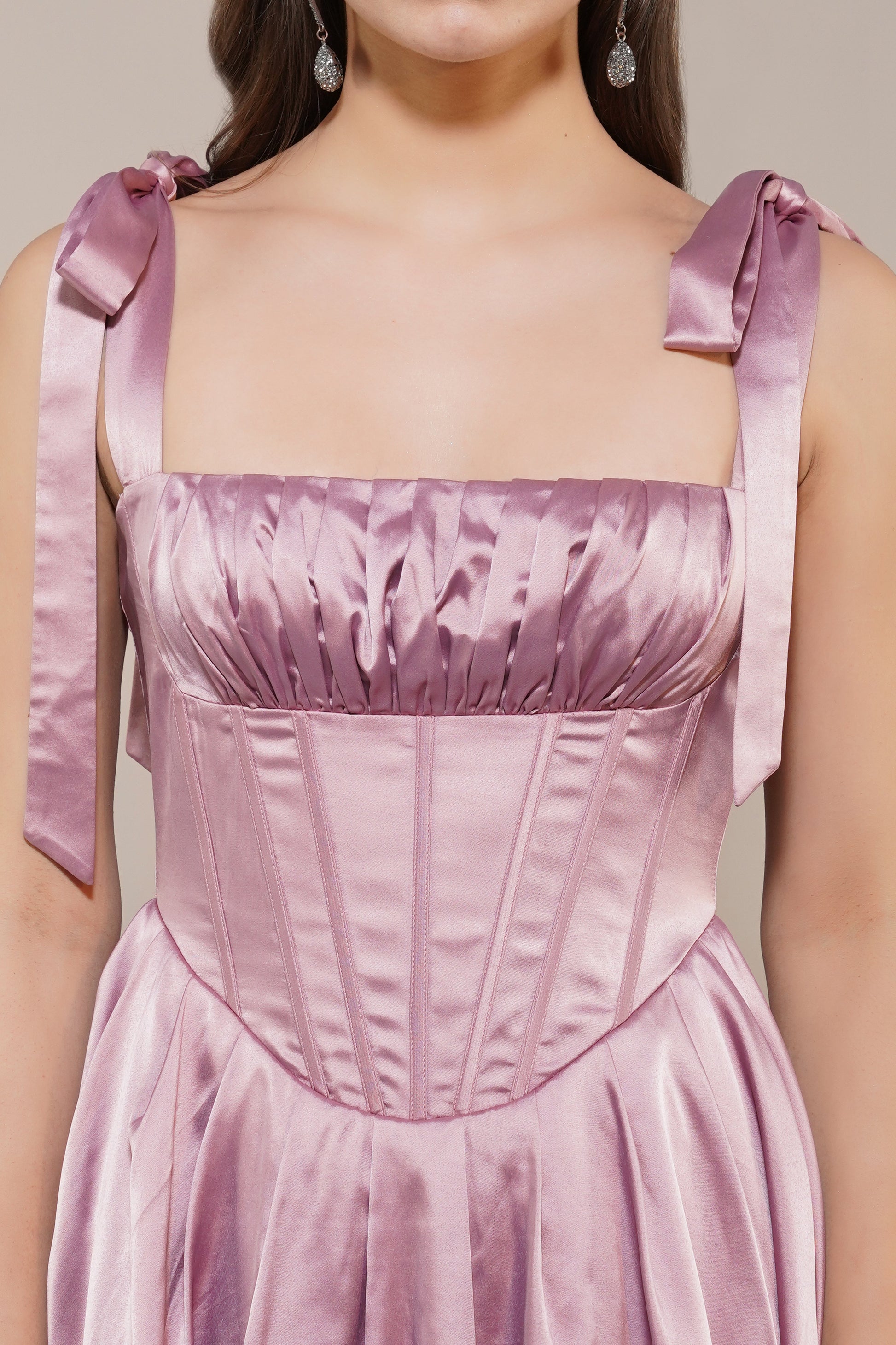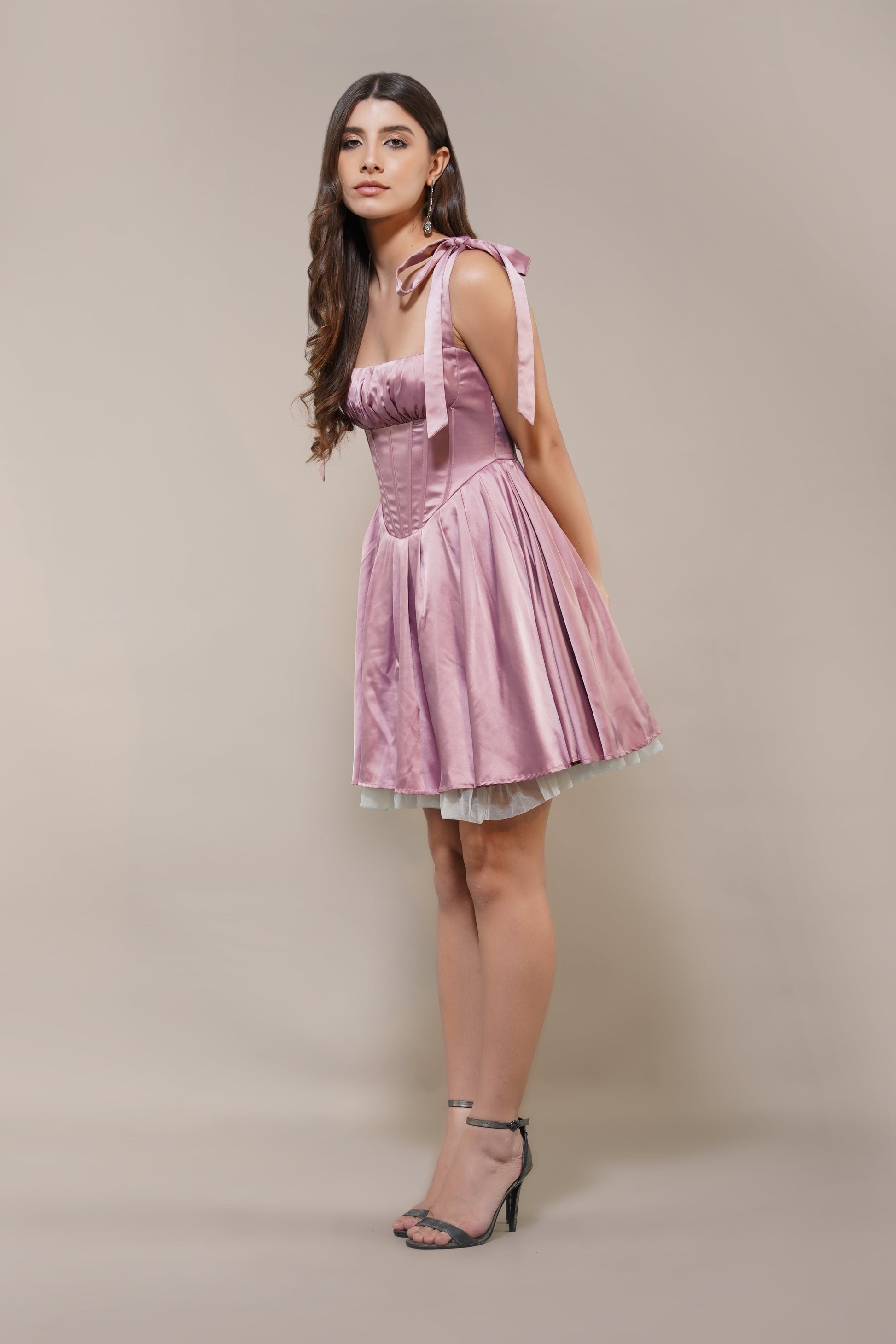 Lace & Beads Amai Mini Dress in Dusty Pink. Inspired by the cutesy milkmaid trend, the Amai Mini Dress in Dusty Pink features a structured corset-style bodice for a flattering silhouette, this dress is adorable yet elegant. The adjustable bow-tie shoulder straps add a playful yet elegant touch, while the flared satin skirt with a subtle peek of white lining exudes a sexy charm.