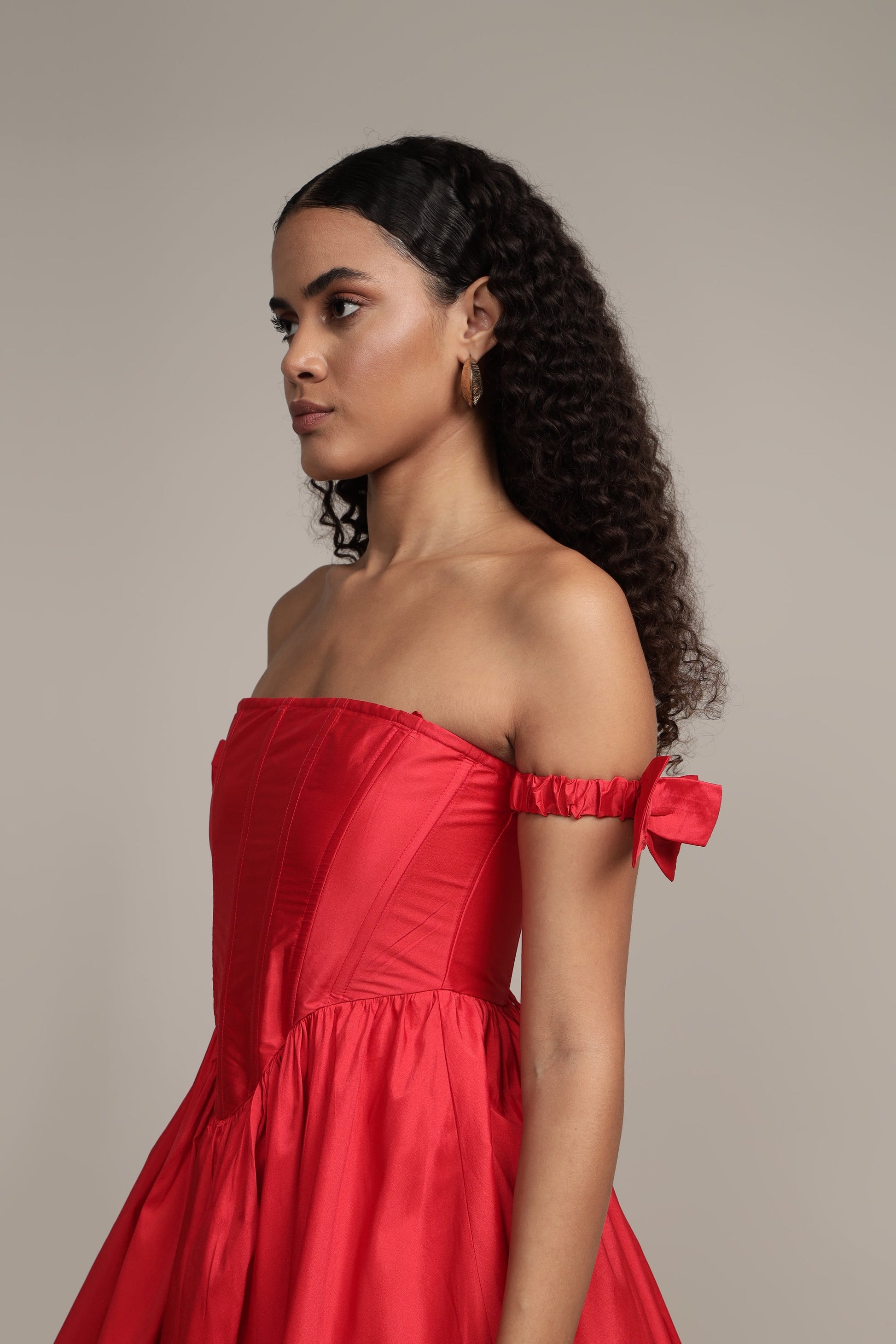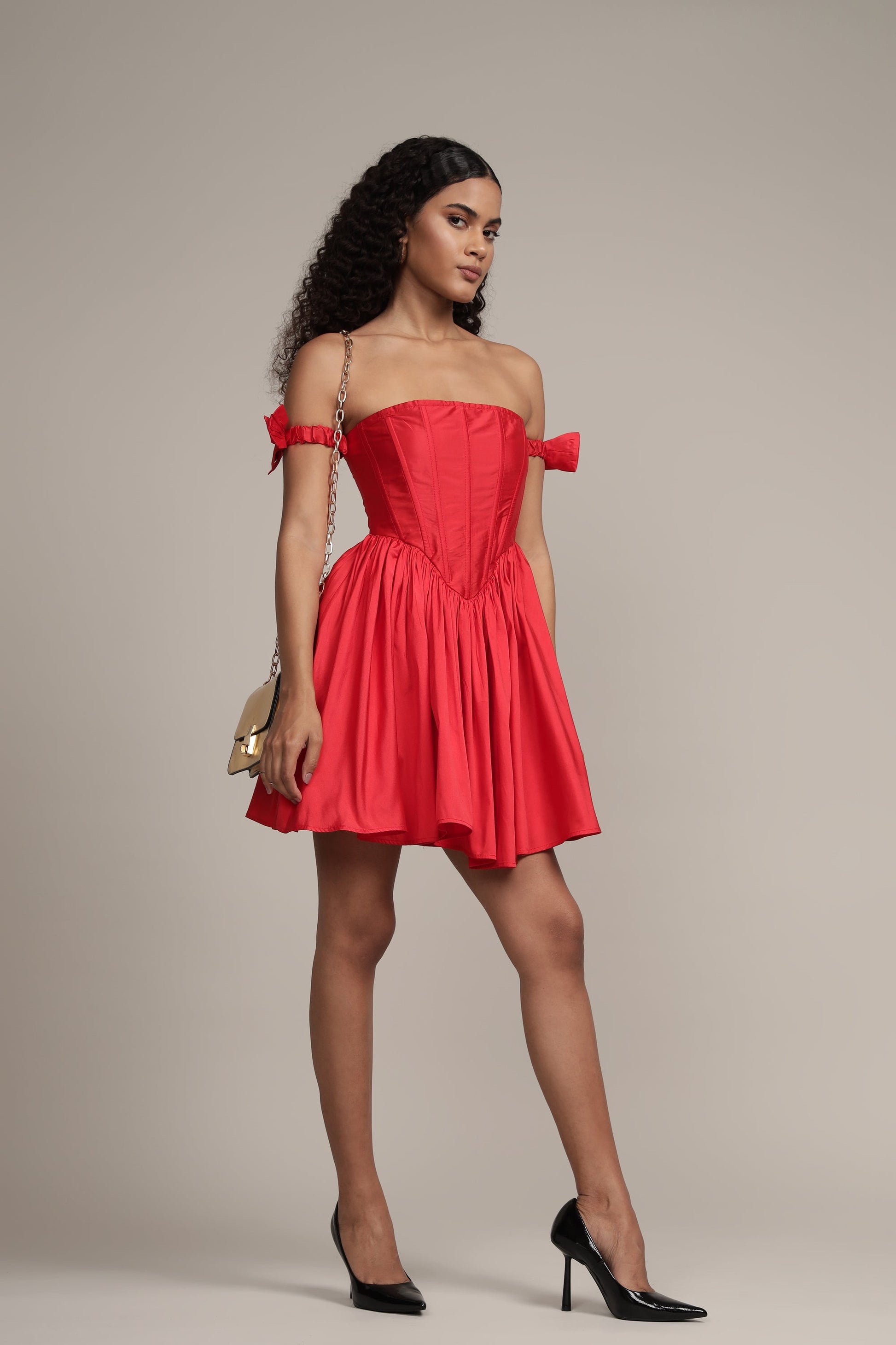 Lace & Beads Carly Corset Mini Dress in Red. Allow me to introduce you to our latest red hot dress: The one and only, Carly. Featuring an adjustable corset bodice, off the shoulder cutesy sleeves and a flattering a-line skirt, this taffeta mini dress is a delightful new addition to your evening wardrobe.