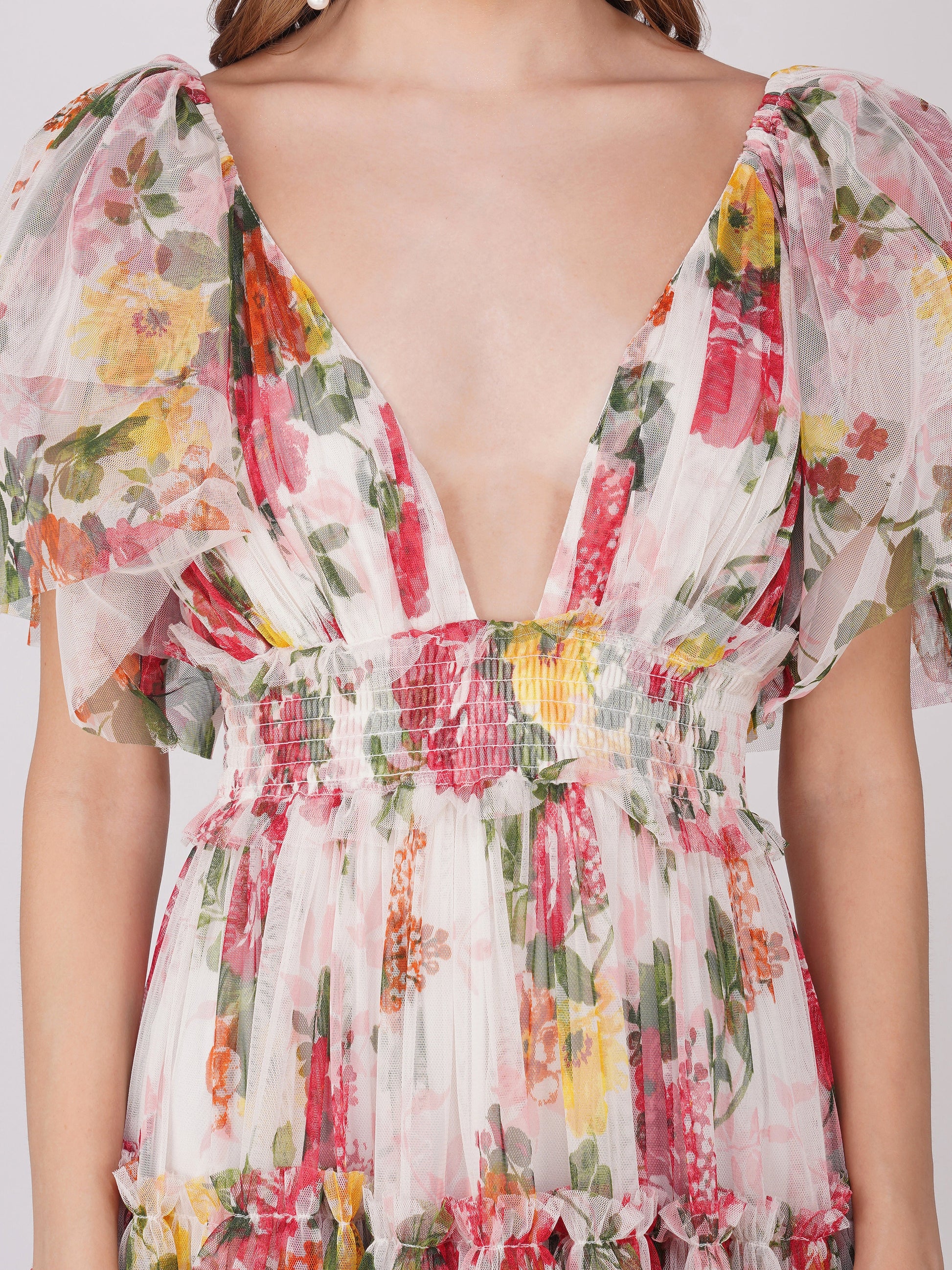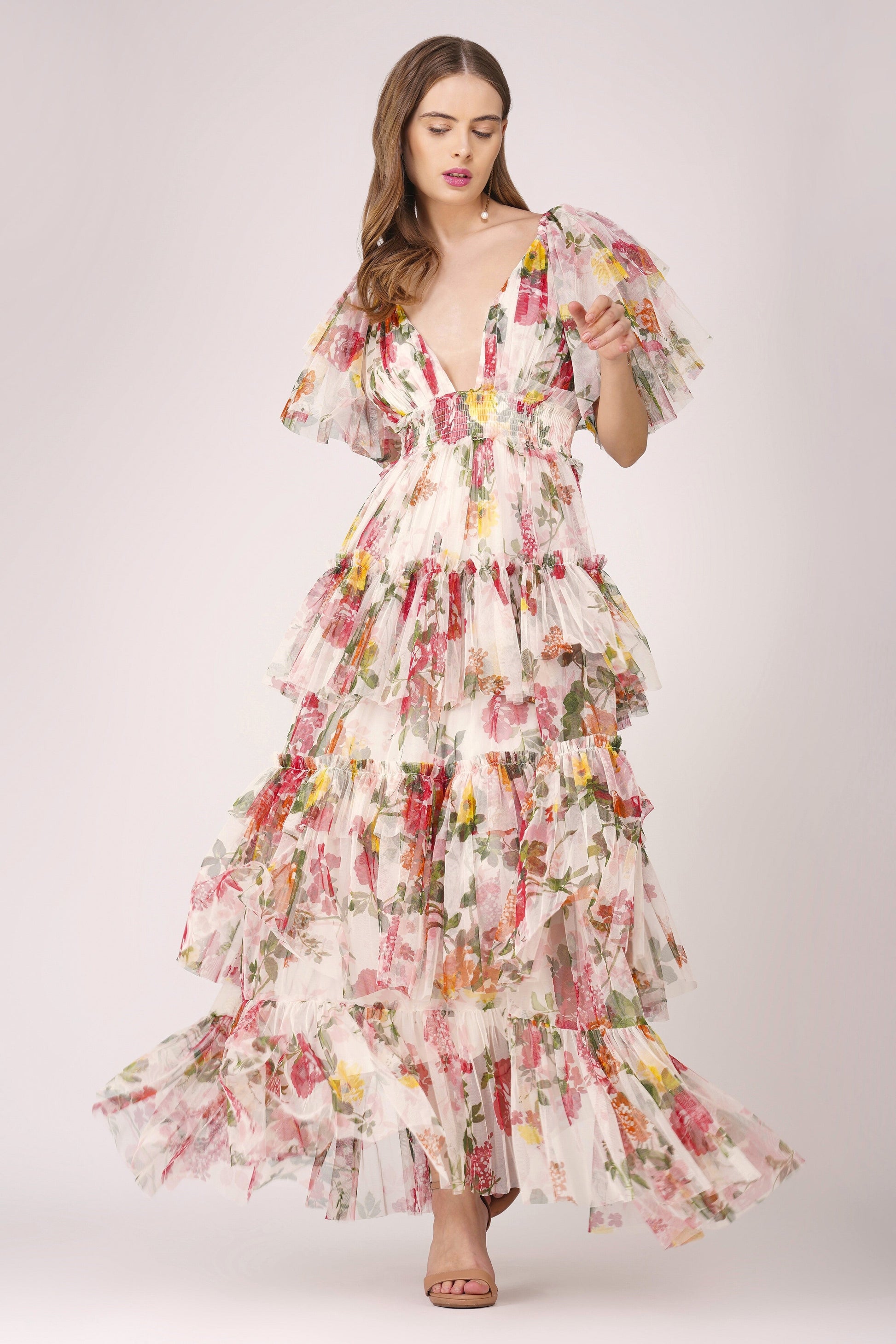 Lace & Beads Jasmine Maxi Dress in Floral Print. This floral dress features a deep v-neckline top that meets at a cinched waist and flows into a beautifully tiered skirt. This dress is created with a soft tulle that flows as you walk. It is finished with sheer waterfall sleeves for an elegant look.