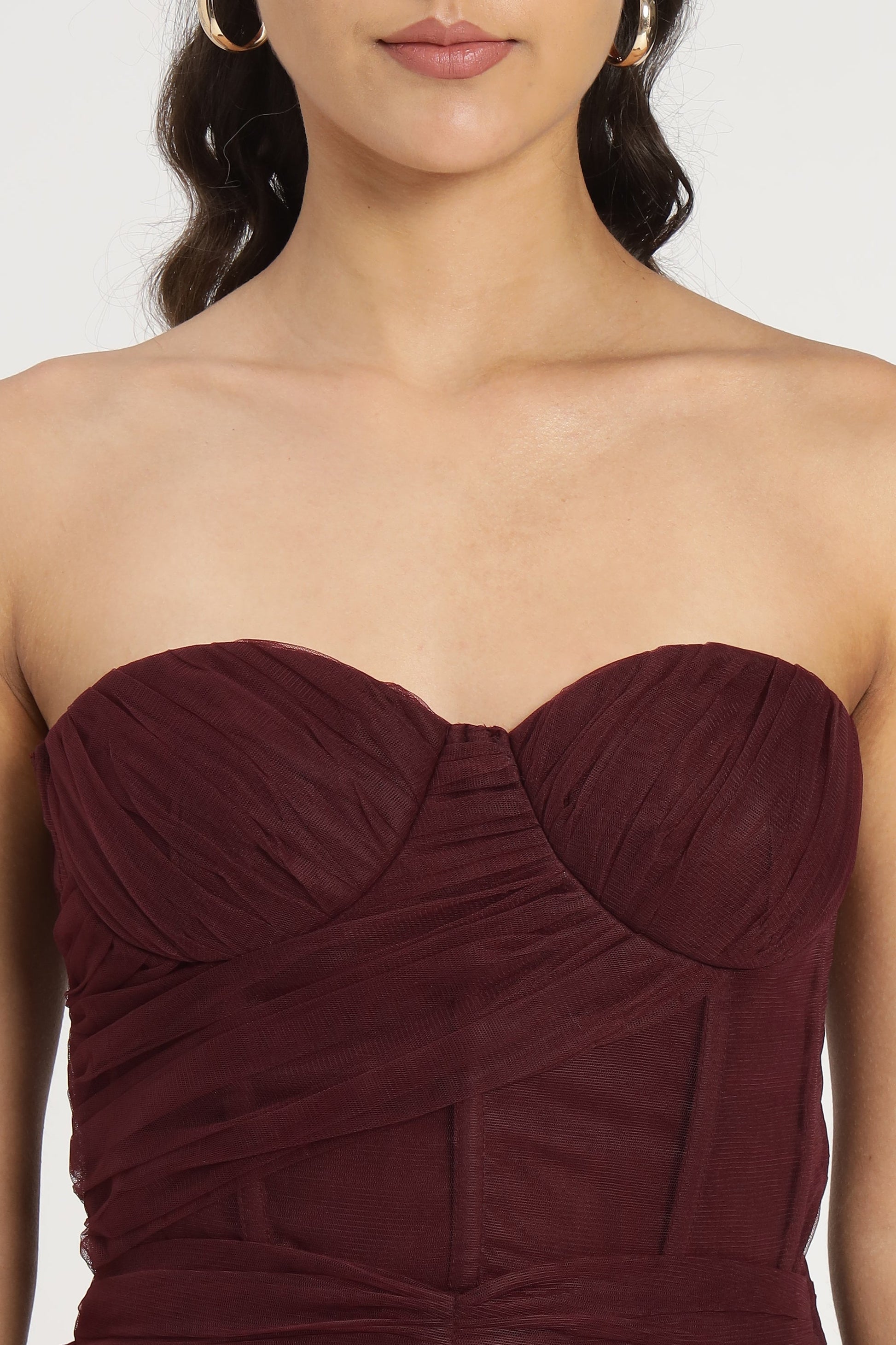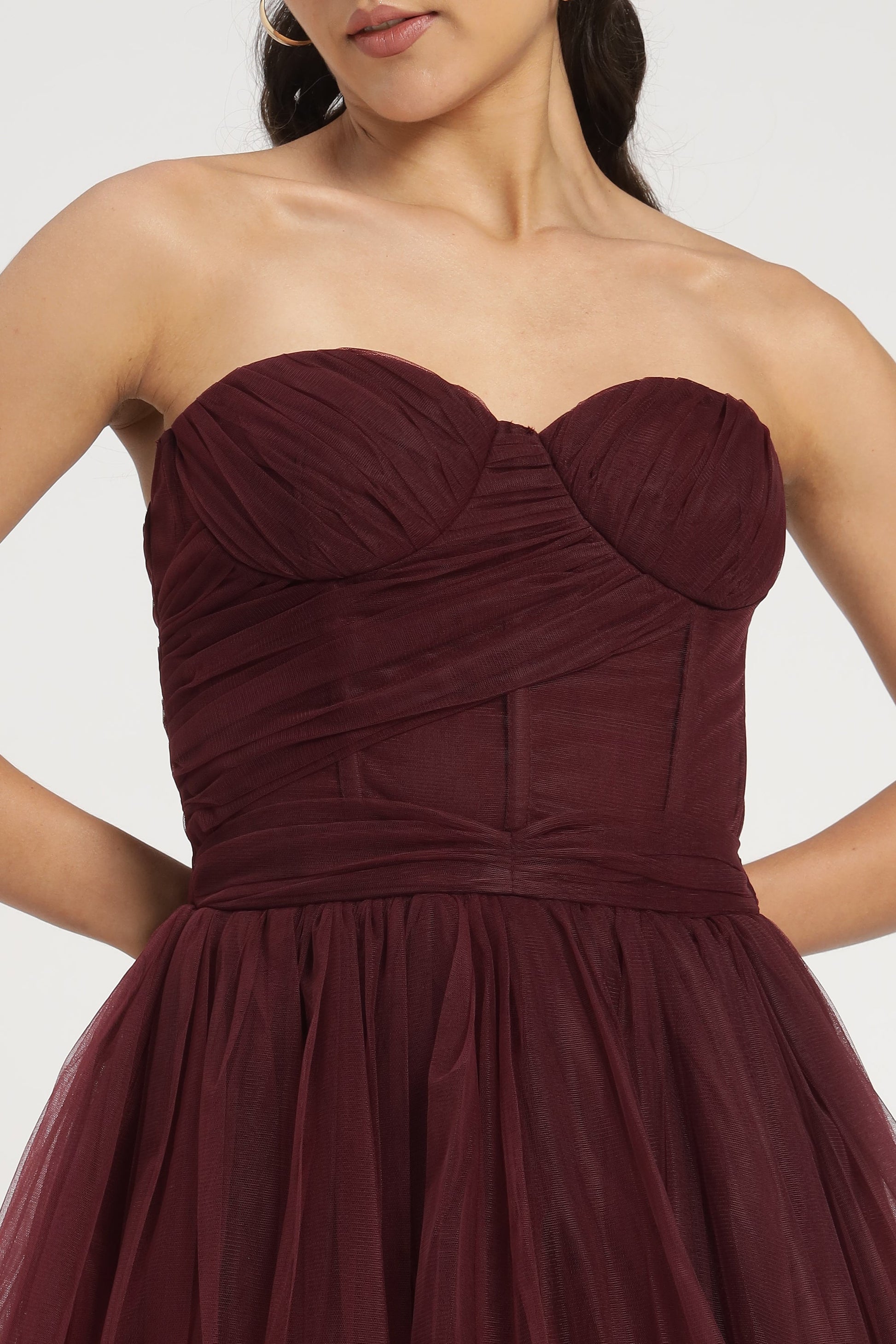Lace & Beads Lauren Plum Tulle Mini Dress. Meet Lauren: an iconic Lace & Beads style. Notice the defined cups, corset detailing on the bodice which is draped with tulle. The mini skirt is made full by the generous layers of stiff tulle. If you are looking to make an impact, look no further than this flawless prom style dress.