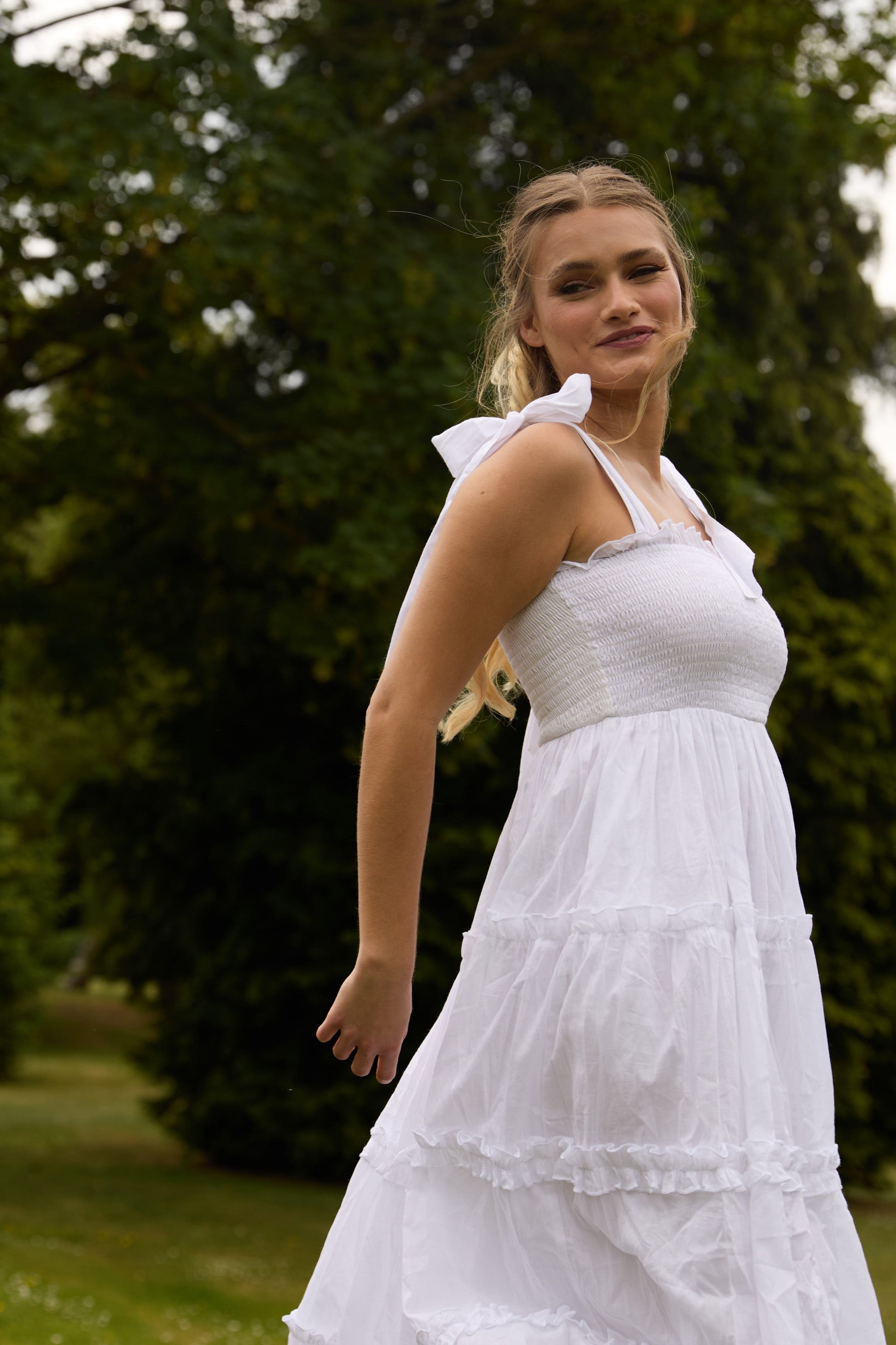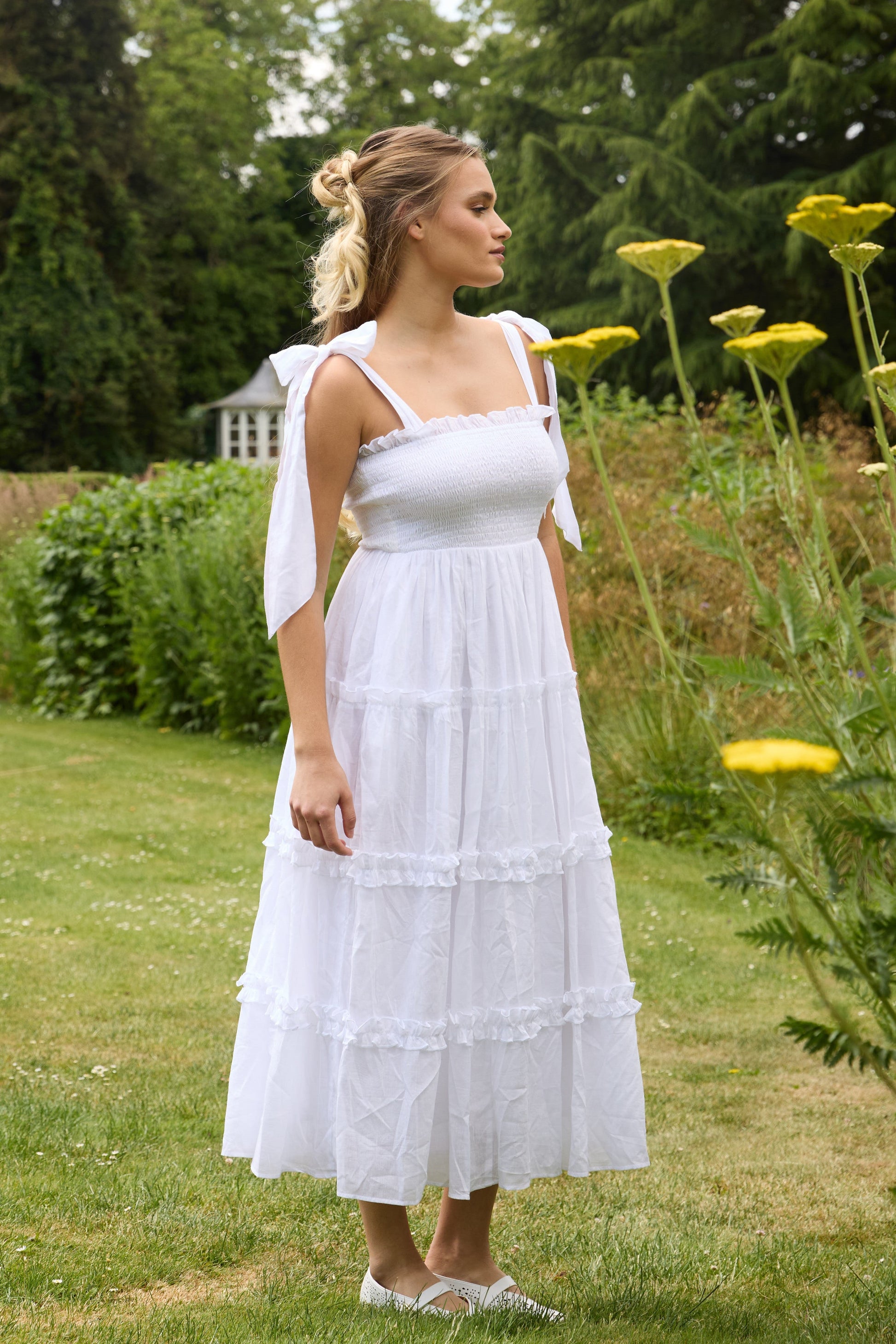 Lace & Beads Louise Cotton Midi Dress in White. Feminine, floaty, and full of charm, the Louise Midi Dress in white is a warm-weather wardrobe essential. Crafted from breathable cotton, it features a flattering straight neckline and a fully smocked bodice for a comfortable, flexible fit. The adjustable tie straps offer a playful and customisable finish. Ideal for picnics, weekend getaways, garden parties, or relaxed summer gatherings.