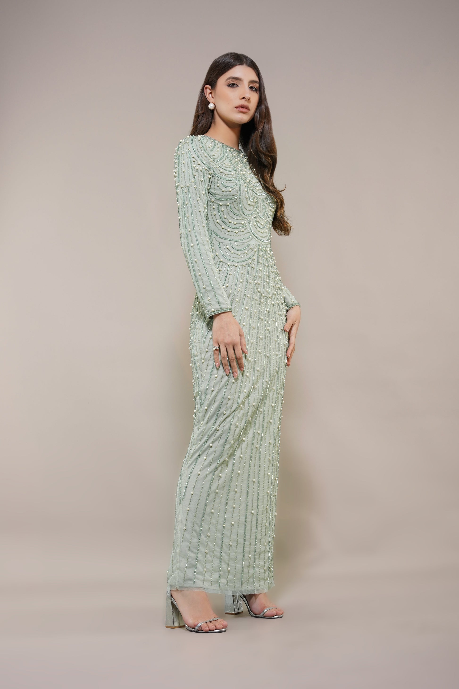 Lace & Beads Mabel Embellished Maxi Dress in Pistachio. This gown is the perfect mix of elegance and vintage charm. With its stunning hand-embellished beadwork, high neckline, and long sleeves, this modest dress is effortlessly sophisticated while still feeling modern. The figure-skimming fit and delicate pearl details give it a dreamy, art-deco-inspired vibe—perfect for weddings and other special occasions.
