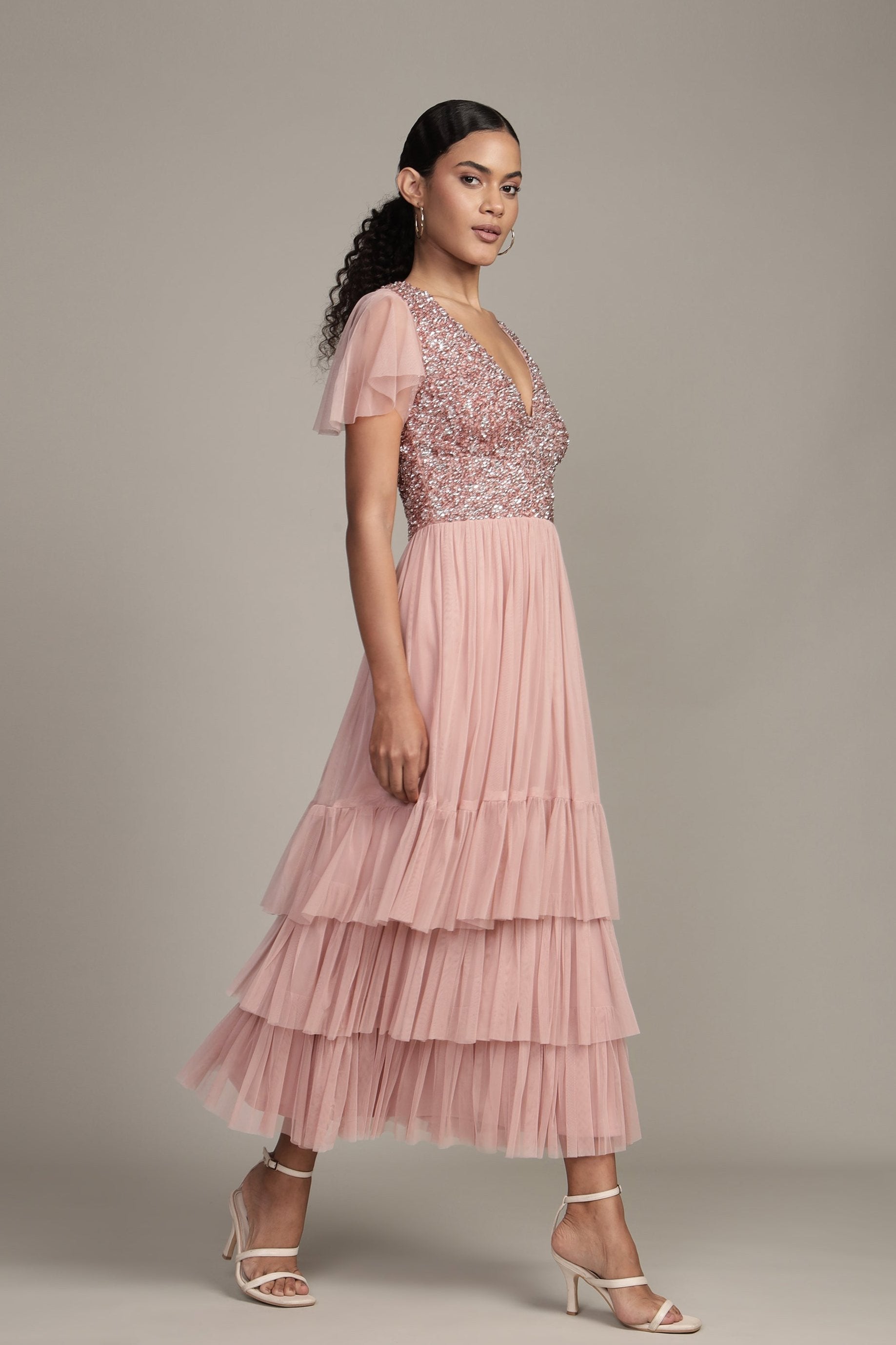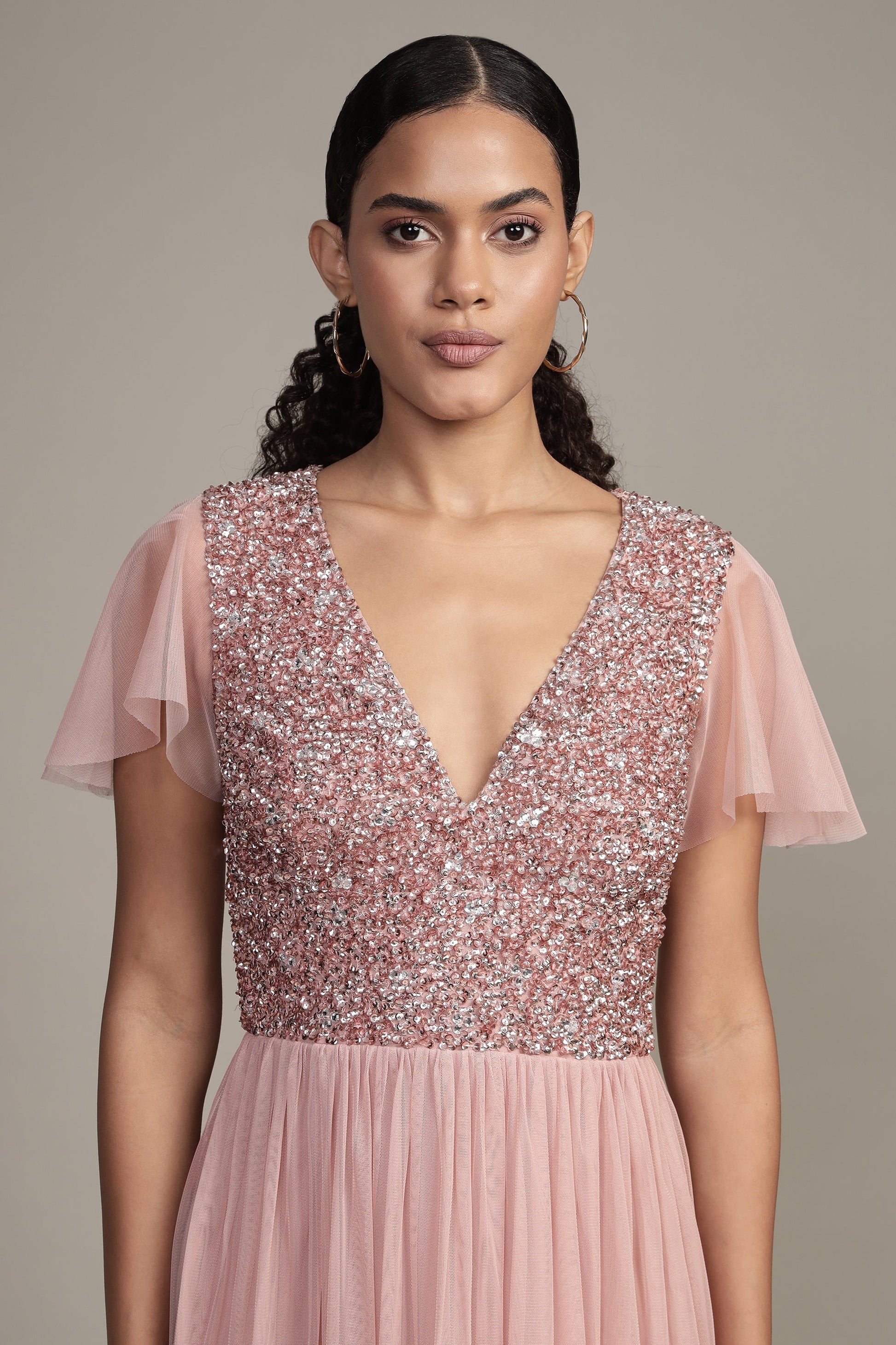 If you love our best selling style Madison, you are going to adore her shining sister Maddie. Whether you prefer the dusty pink or blue, Maddie will win over your heart. Featuring a plunging v-neckline and a bodice covered in sparkling embellishment, this is the perfect cocktail dress for the party season. The a-line layered midi skirt is made of soft tulle that sways with you as you walk. It is finished with sheer waterfall sleeves for an elegant look. Ideal for weddings, balls, galas and more, you cannot go wrong with Maddie.