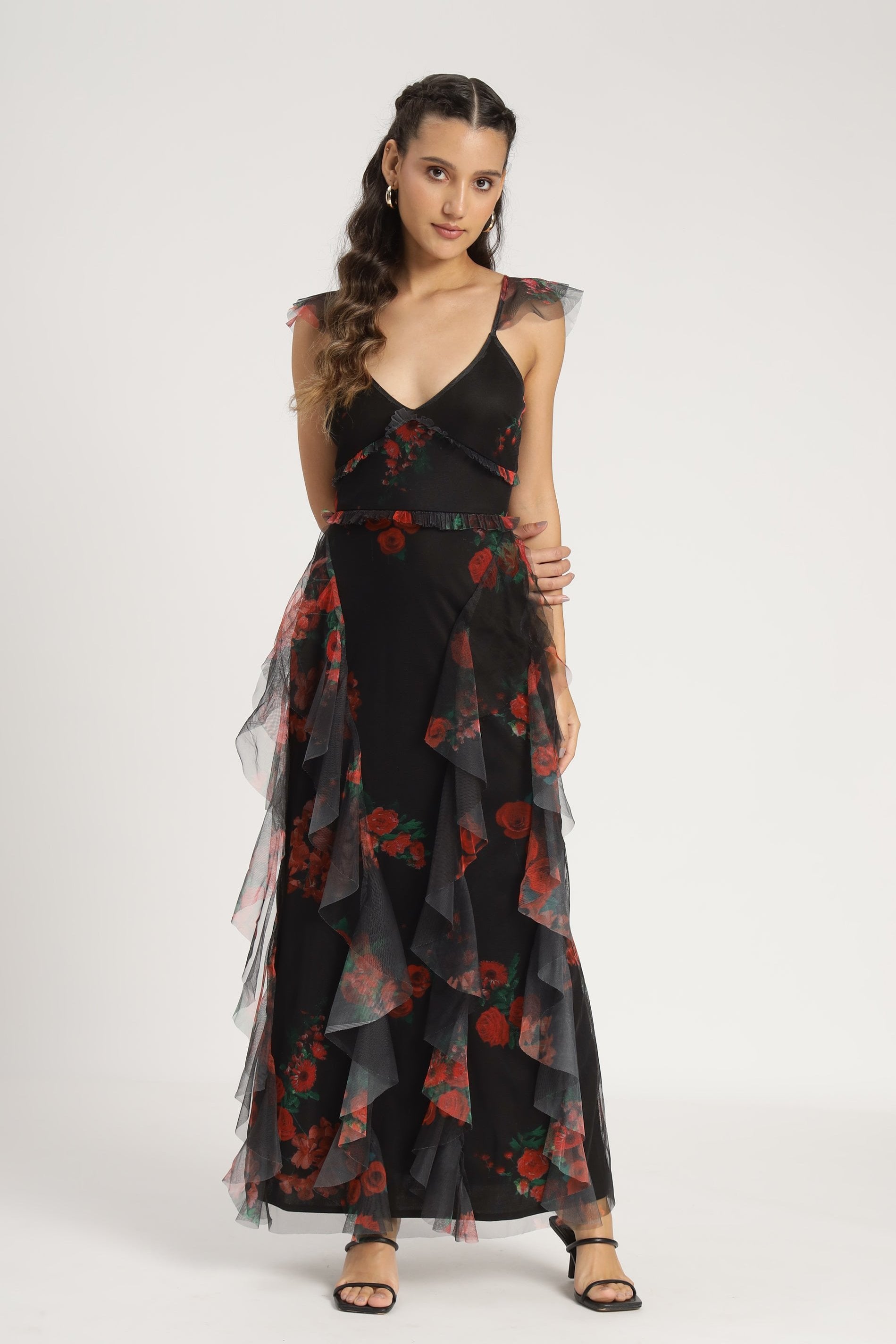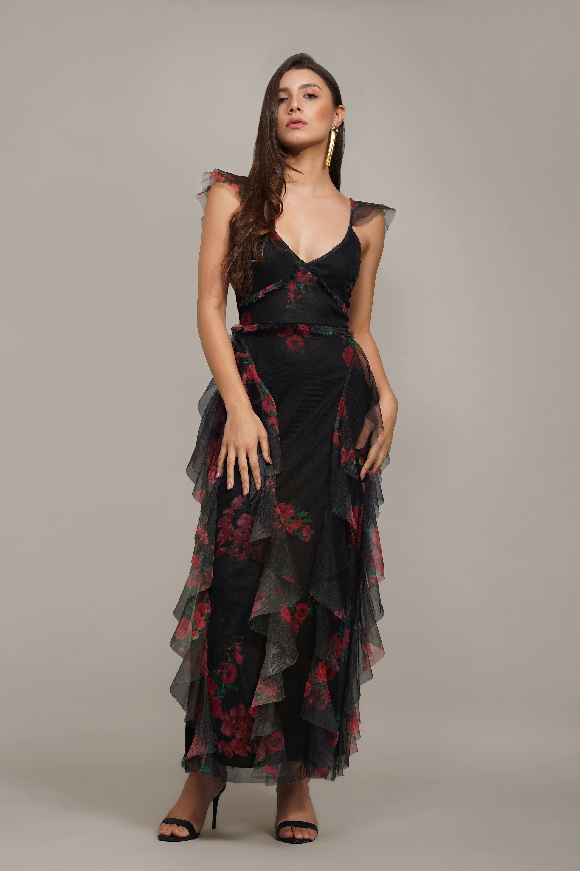 Lace & Beads Malin Maxi Dress in Black and Red Floral. Become your own Femme Fatale in the Malin Dress, featuring an enchanting black and red floral print.