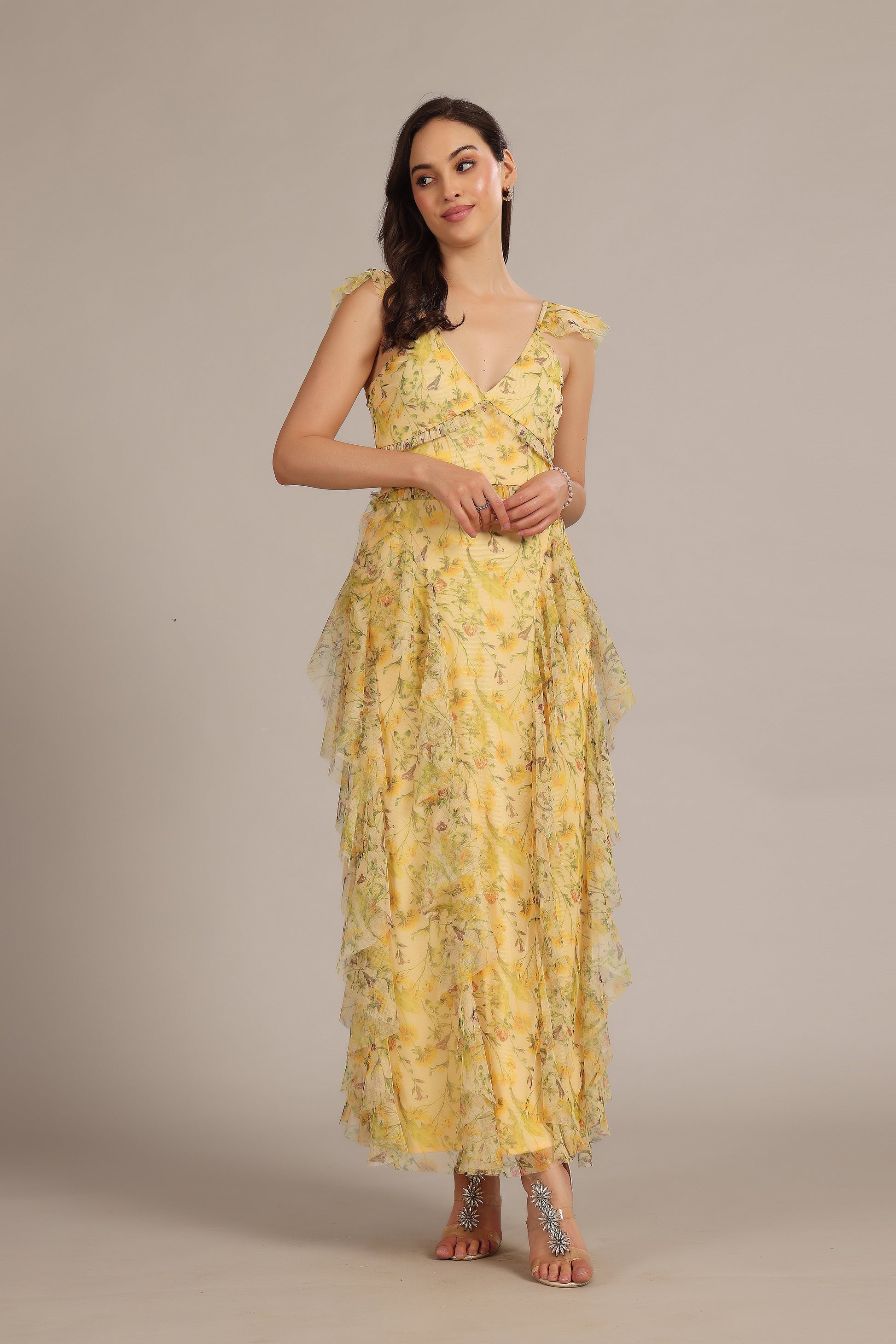 Crafted from lightweight fabric, this yellow floral dress moves beautifully and offers both comfort and style. The delicate floral print adds a romantic touch, making it a standout choice for a summer wedding guest dress, holiday occasionwear or daytime celebration look.