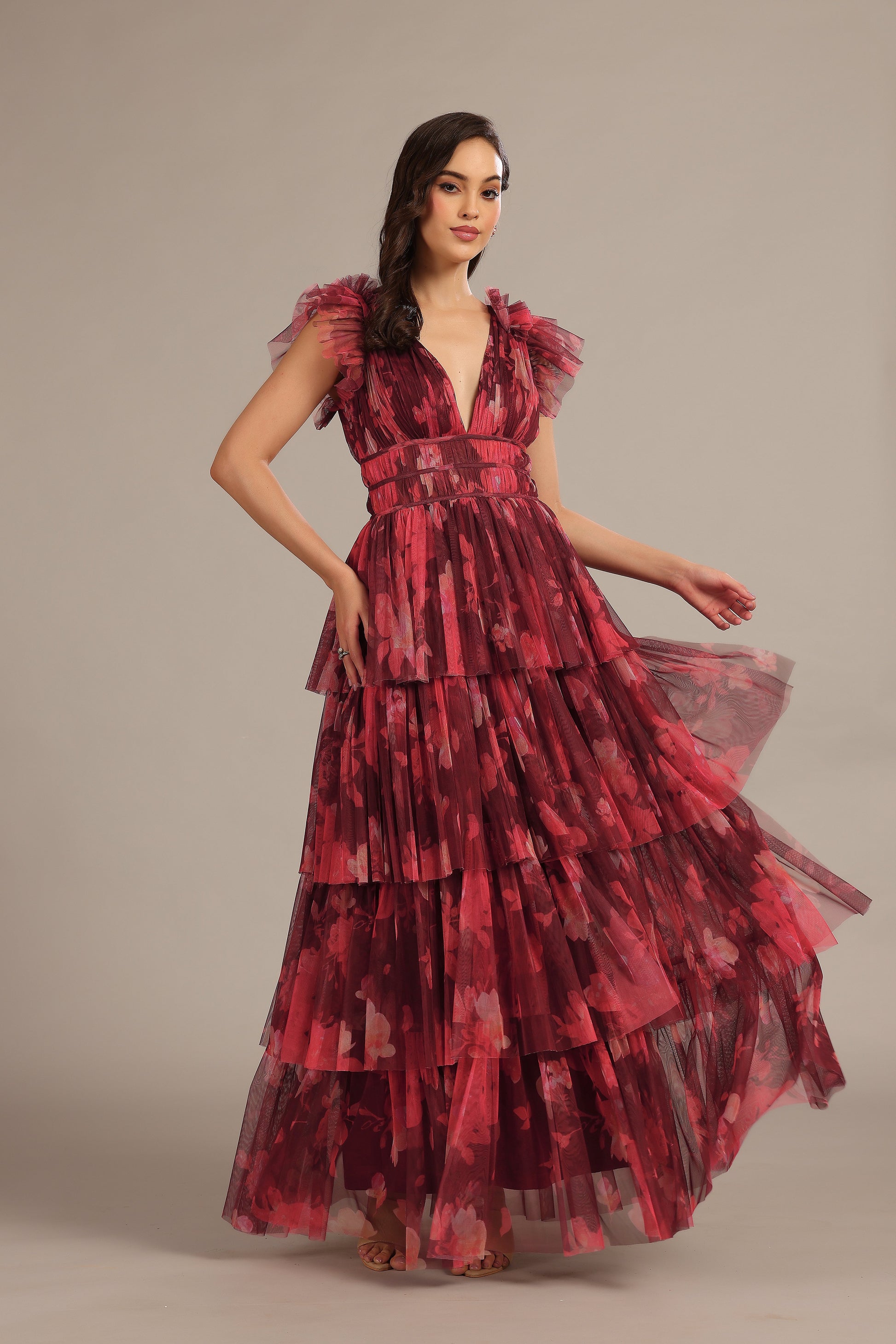 Lace & Beads Naomi Maxi Dress in Deep Red Floral. A romantic style made for standout moments. With soft tulle layers, a flattering V-neckline, and a fitted waistband, it creates a floaty, feminine shape that's easy to wear. The rich red floral print adds a bold touch, while the tiered skirt brings beautiful movement. Whether it’s a wedding, special event or a summer evening out, Naomi is your go-to for looking effortlessly elegant with a little drama.