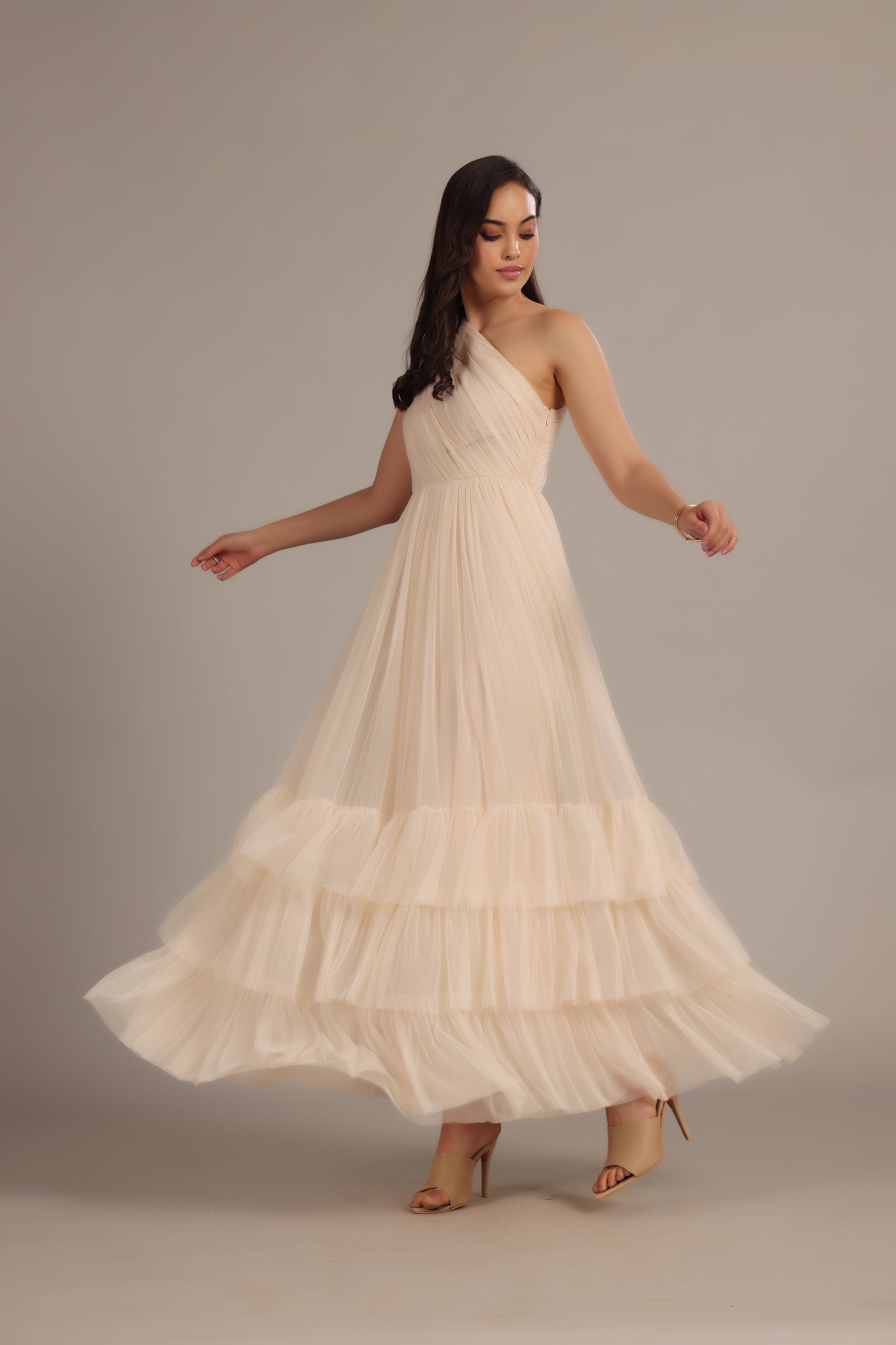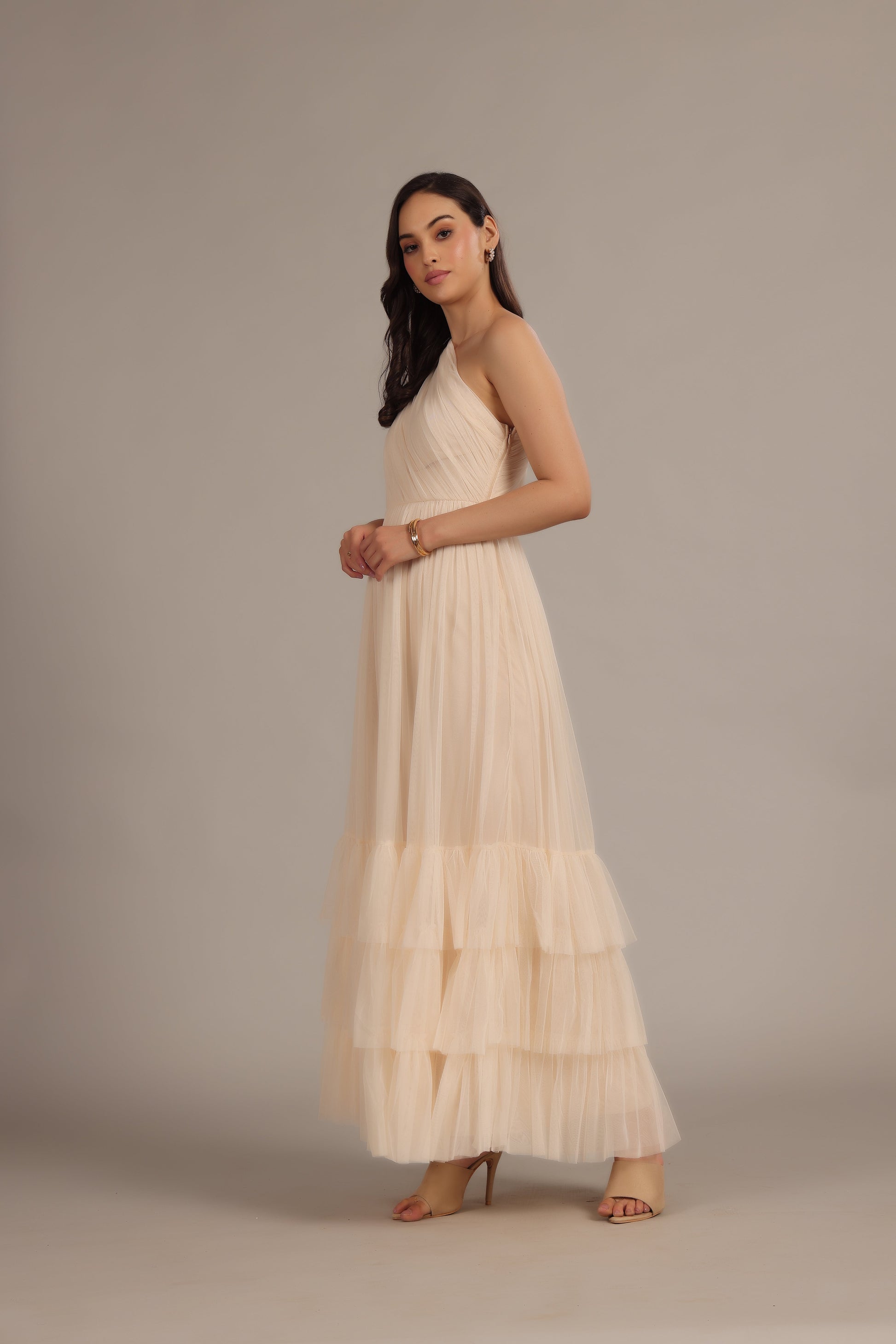 Lace & Beads Nicolette One Shoulder Maxi Dress in Champagne. Meet your new go-to for making an entrance - the Nicolette One-Shoulder Maxi Dress in Champagne. With its dreamy one-shoulder design and soft mesh fabric, this dress brings just the right amount of drama. The fitted waistband gives you that snatched look, while the tiered maxi skirt flows with every twirl. Simple, chic, and totally unforgettable.