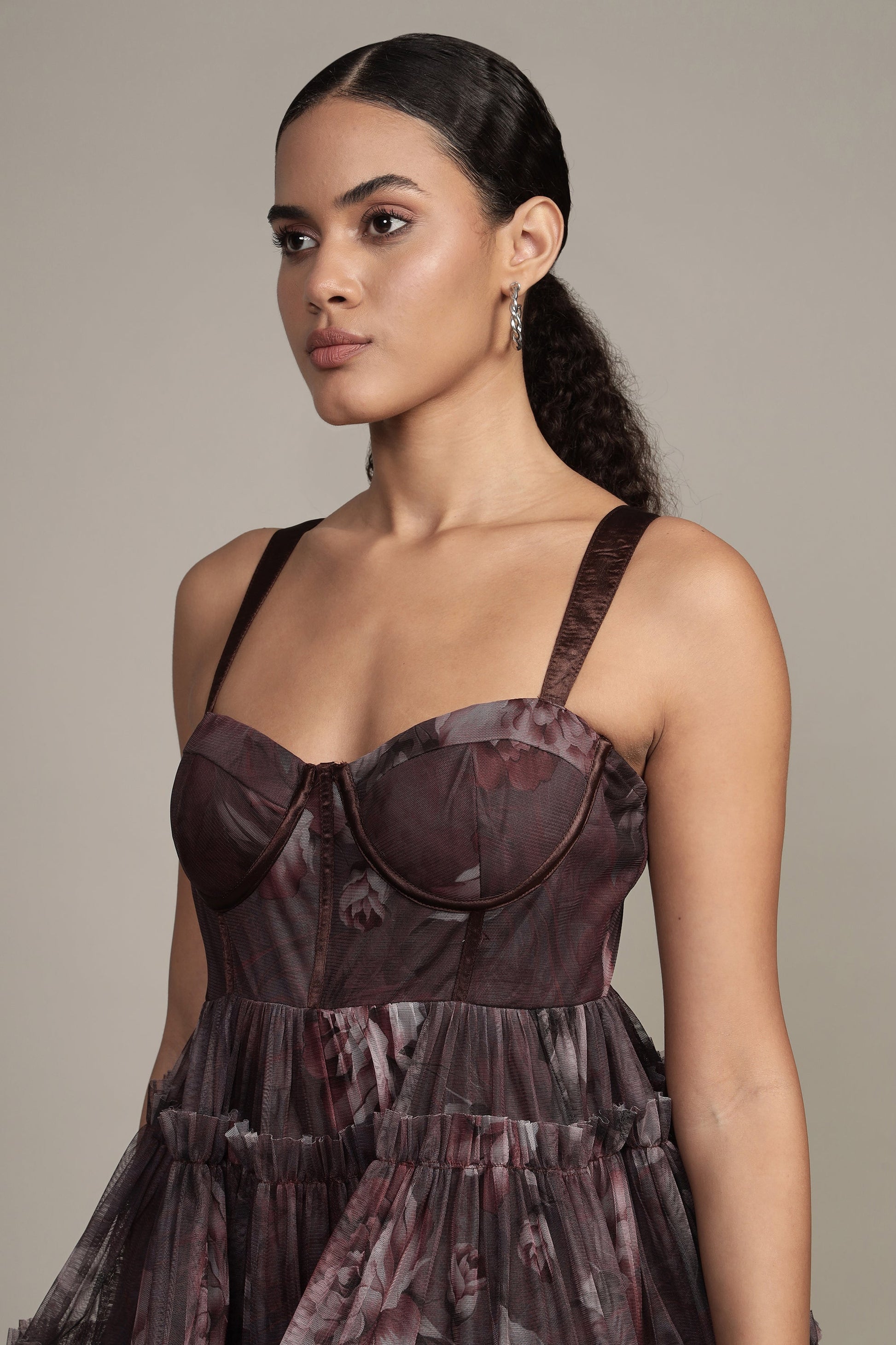 Lace & Beads Raelynn Mini Dress in Plum Floral. This striking mini dress features a deep plum floral design. It features a structured, corset-style bodice with defined cups, adding a touch of sophistication and support. The fitted top is contrasted by a voluminous, tiered skirt that creates a playful and dramatic silhouette. The delicate layers of fabric are adorned with subtle ruffle detailing and soft floral prints, giving the dress an ethereal, feminine look. Adjustable shoulder straps and a fitted waist complete the design, making it perfect for a night out or special occasion.
