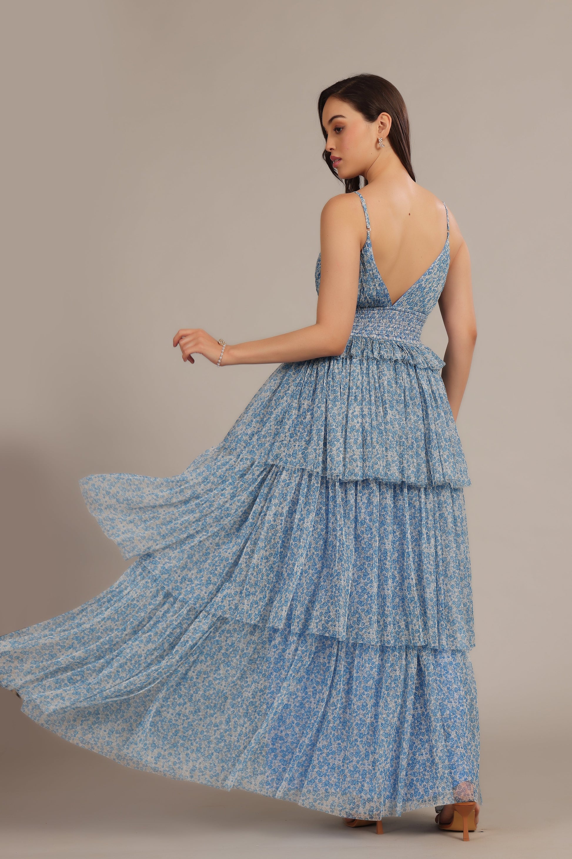 Lace & Beads Rani Maxi Dress in Ditsy Blue Floral. A graceful, romantic piece designed to make a subtle statement. With its tiered silhouette, soft floral print, and flattering smocked waist, this dress brings effortless elegance to any occasion. The deep V-neckline and delicate straps add a touch of femininity, while the flowing layers create beautiful movement as you walk. Perfect for garden parties, weddings, or warm evenings out, the Rani is a timeless addition to your summer wardrobe.