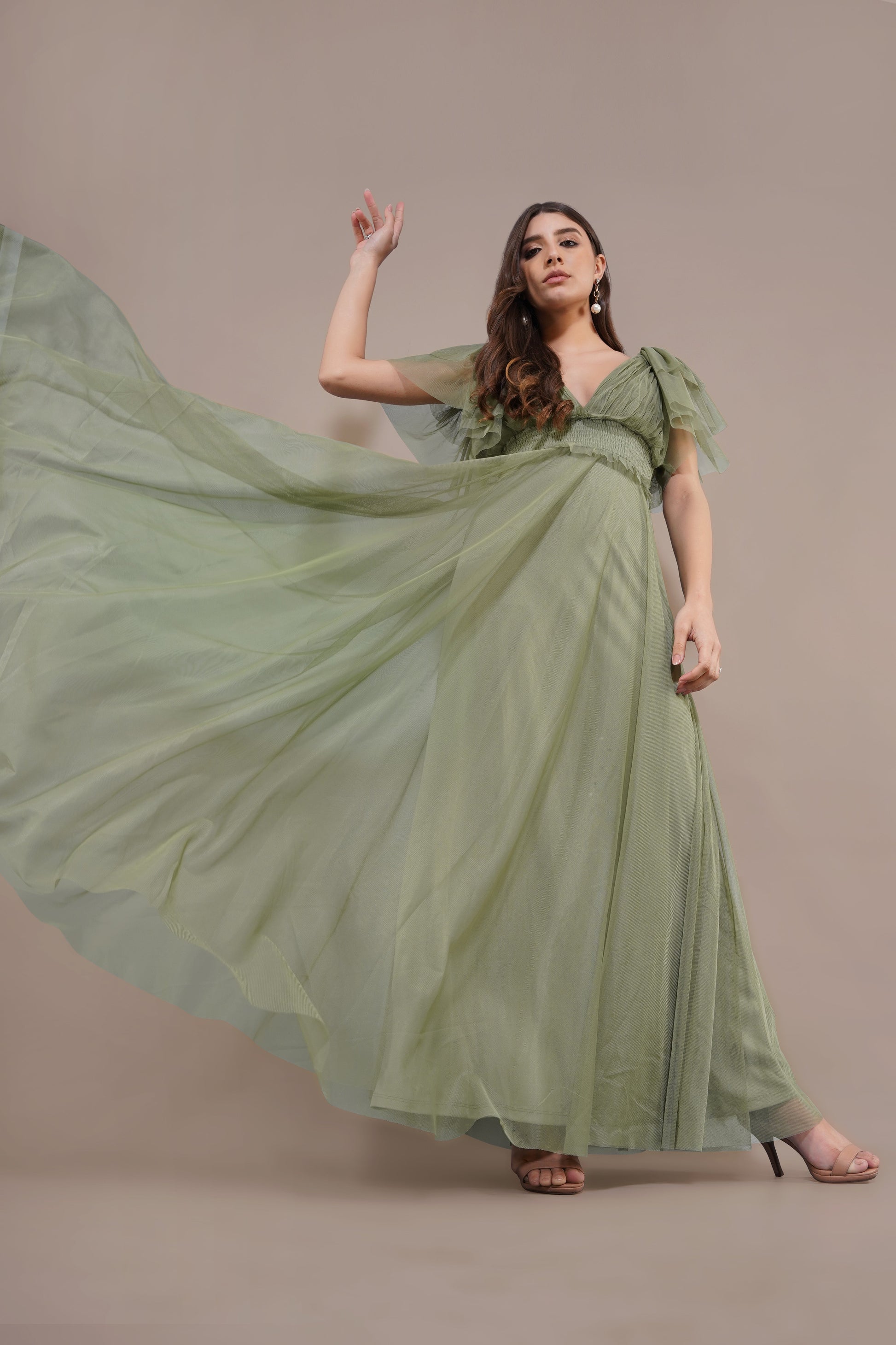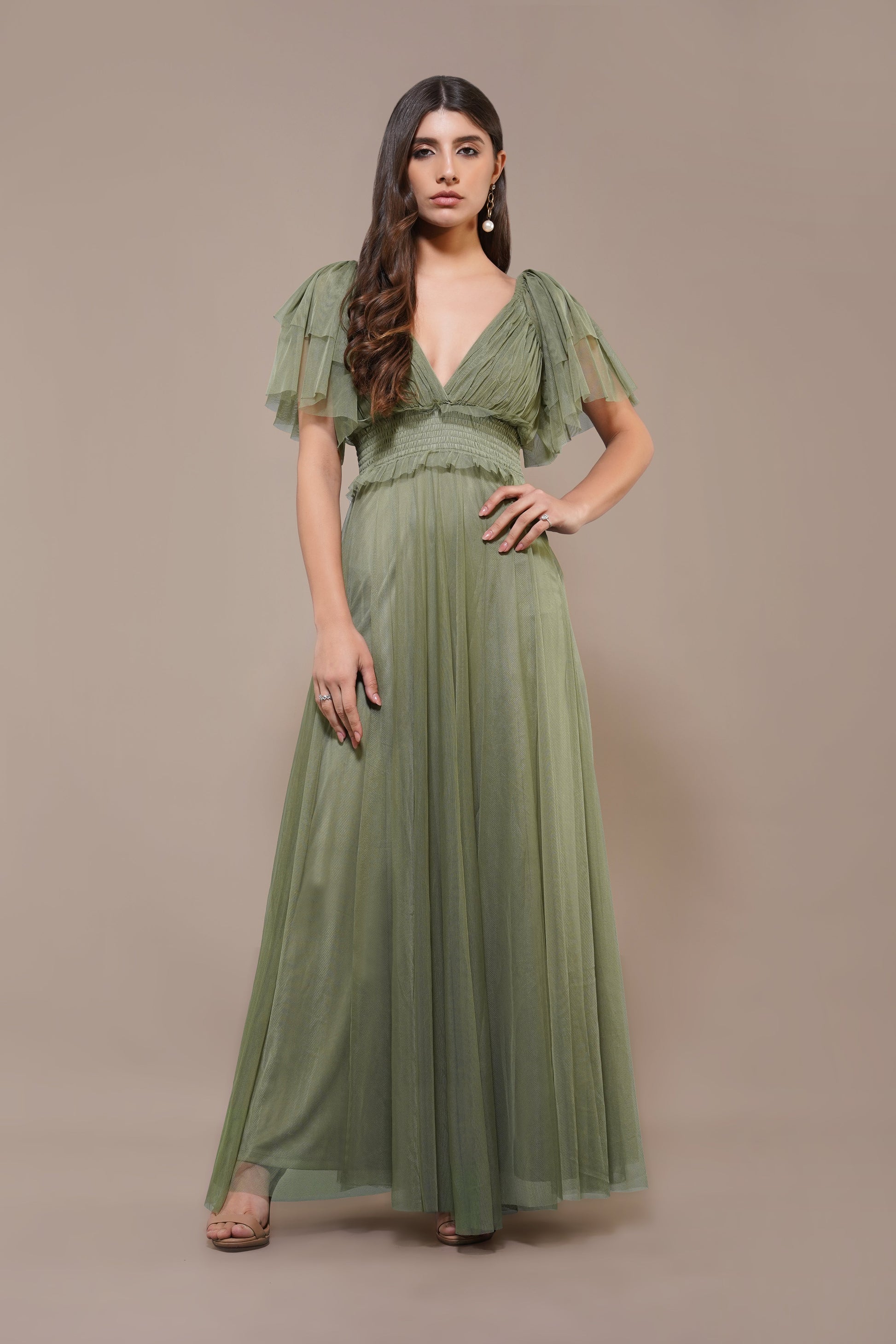 Lace & Beads Shelby Maxi Dress in Soft Olive. This soft olive maxi dress is the perfect mix of effortless and elegant. With a flattering V-neckline and cute flutter sleeves, it’s got a romantic vibe that’s super easy to wear. The smocked waistband gives it a comfy, fitted look, while the flowy skirt adds just the right amount of drama. Made from lightweight fabric with subtle ruffle details, it’s great for weddings, garden parties, or just when you want to feel extra special. Pair it with simple heels and some dainty jewelry, and you’re good to go!