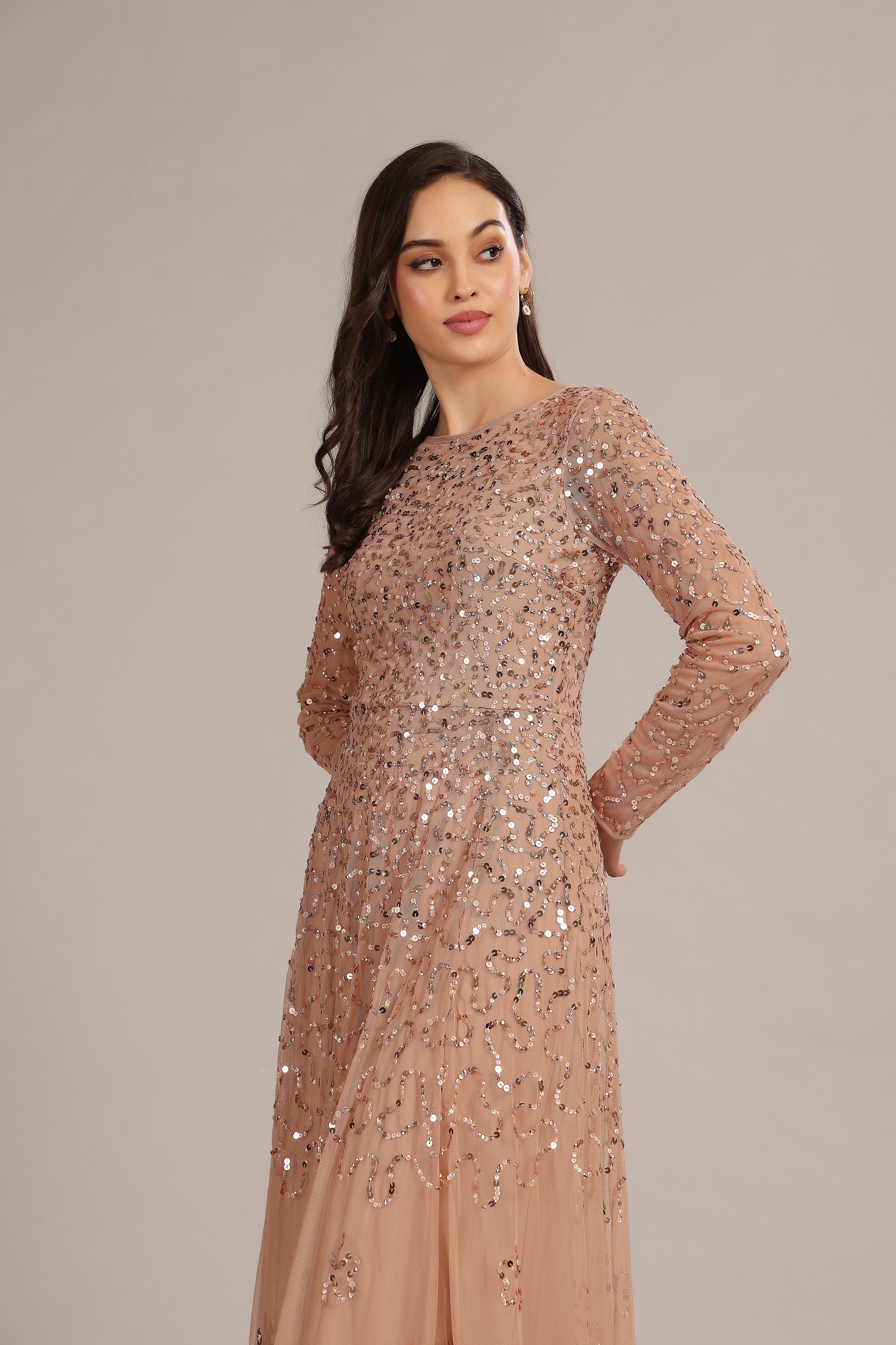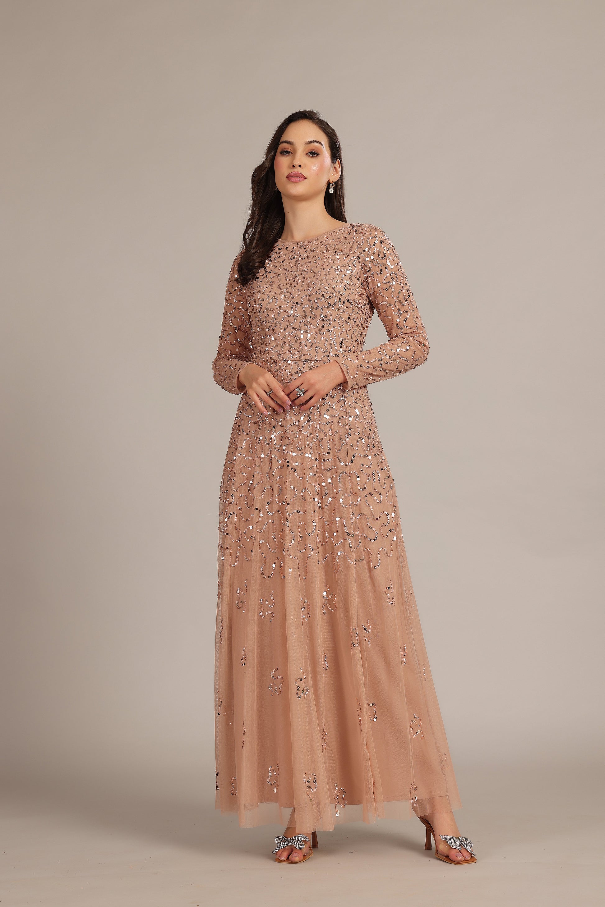 Lace & Beads Sila Maxi Dress in Mink. This long sleeve bridesmaid dress features all-over sequin throughout the dress. It has a high round neckline with a flattering sweetheart lining. The floor-length skirt is crafted in an a-line shape and hand-embellished with a gradient of sequins. It is a beautiful option if you are looking for a modest bridesmaid dress. The hand-embellishment combined with the flattering silhouette makes it the perfect occasion dress, whether you are looking for a modest occasionwear dress, a long sleeve wedding guest dress, or a timeless dress for your next special occasion. Add this timeless gown to your occasionwear wardrobe.