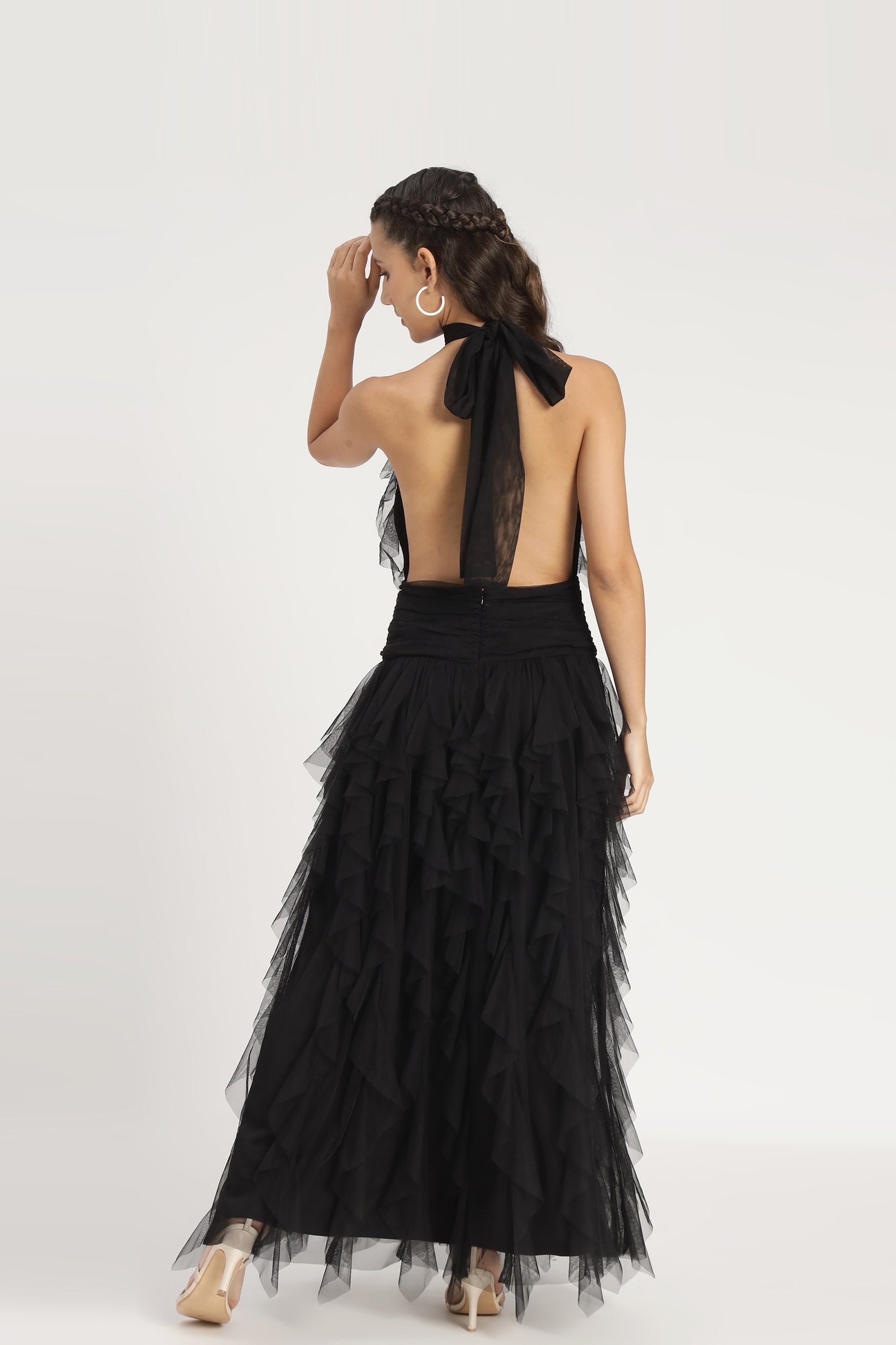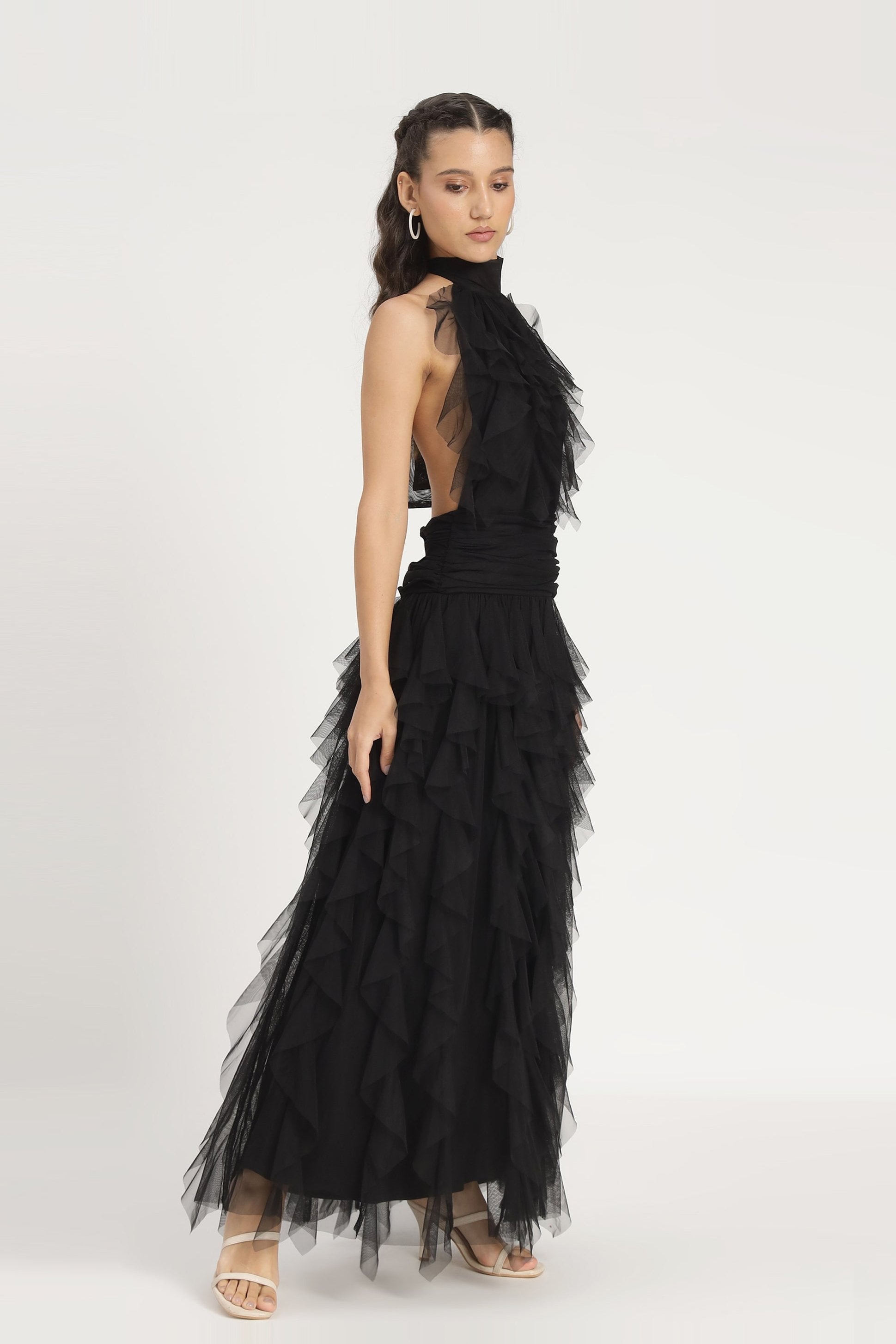 Lace & Beads Tabitha Maxi Ruffle Dress in Black. This dress is a glamorous full-length design with a high neckline, offering a sophisticated yet dramatic silhouette. Crafted from layers of black mesh, it features cascading ruffles from top to hem, creating a voluminous texture and elegant movement. Perfect for evening occasions, black-tie events, or formal galas.
