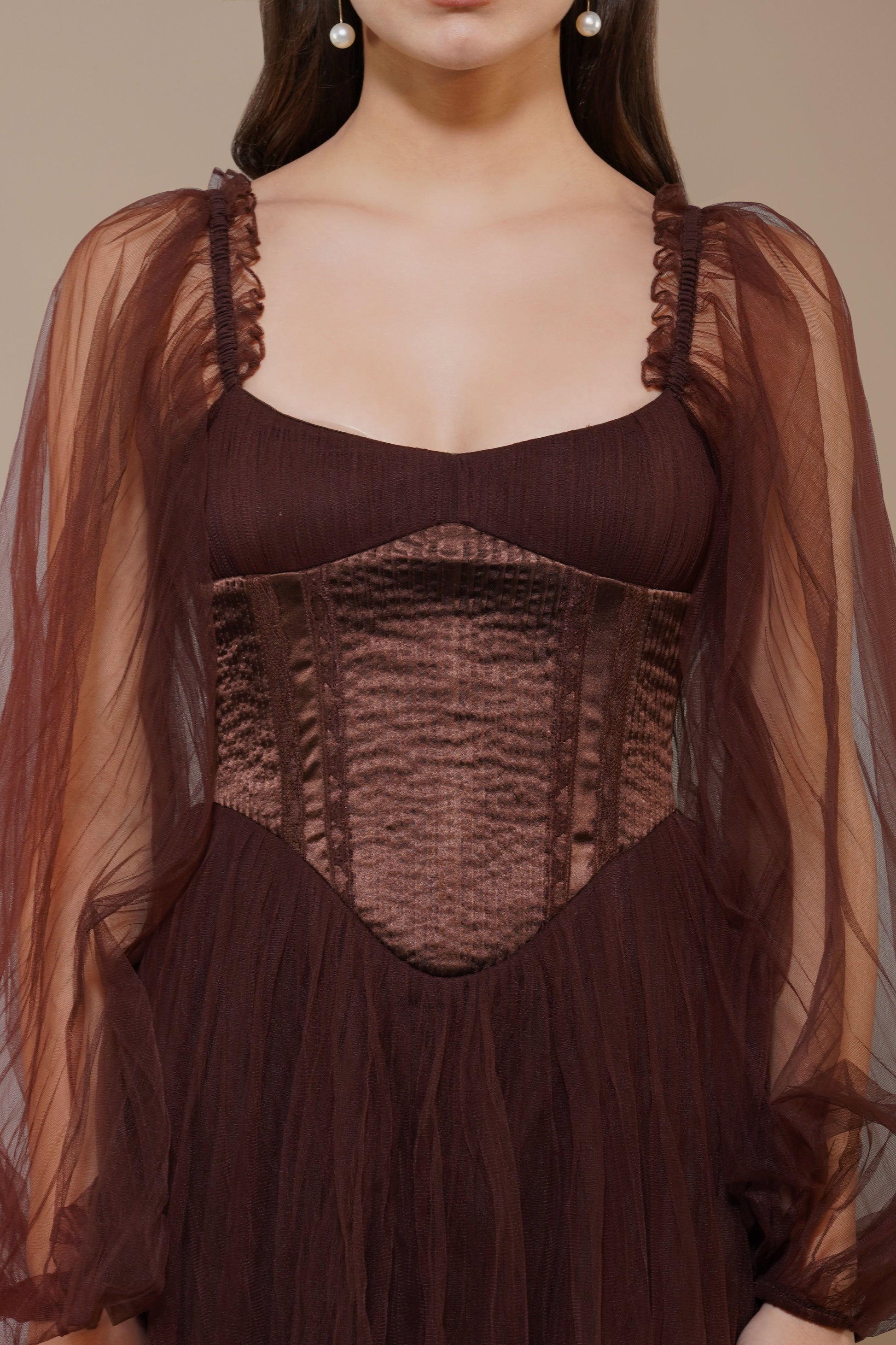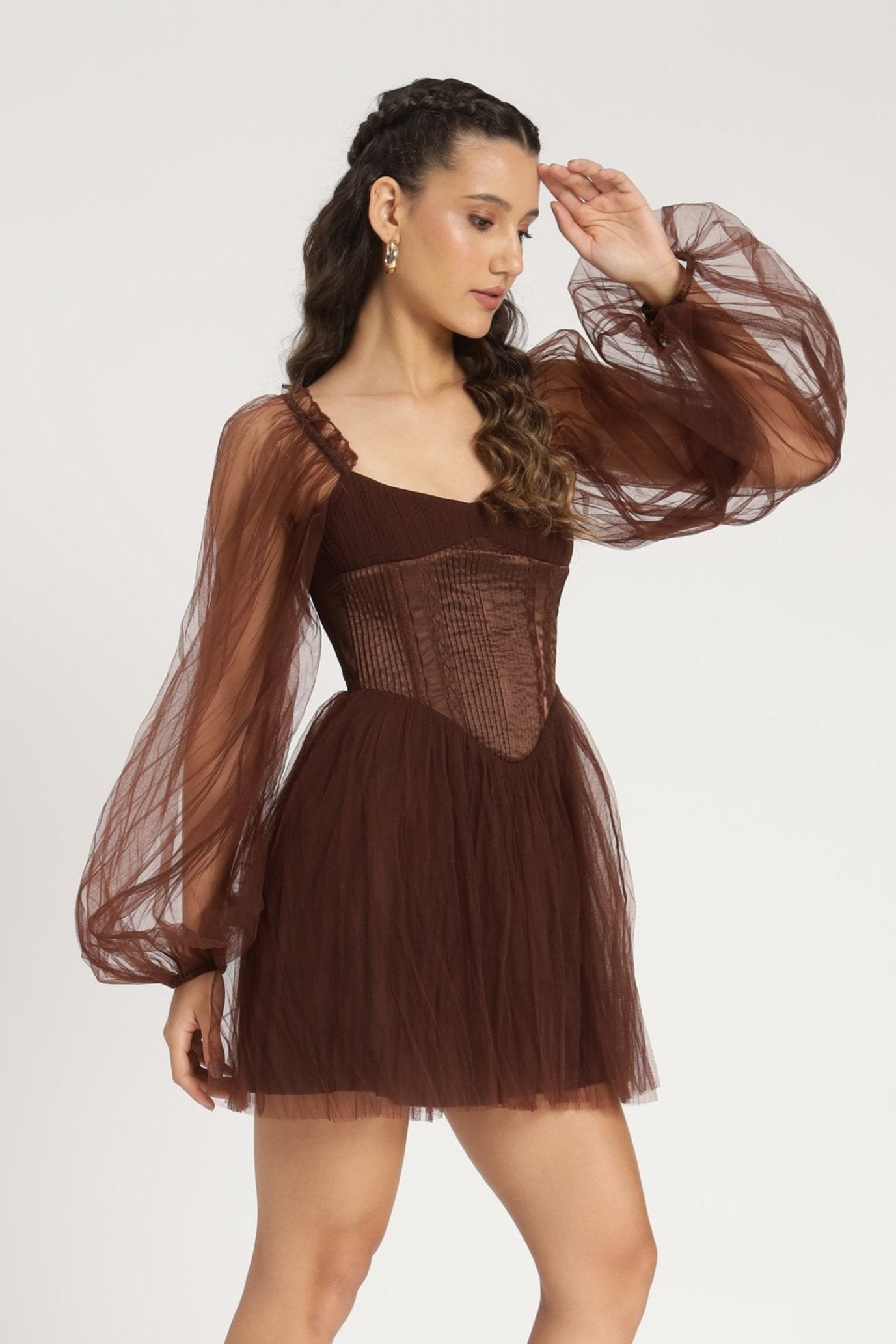Lace & Beads Tara Mini Dress in Coffee Brown. Indulge in the richness of the Tara Mini Dress in coffee brown. This captivating design combines delicate layers of tulle with puffed sheer sleeves for a timelessly feminine look. The corset-style bodice sculpts your silhouette, while the satin lace-up back offers an adjustable fit that’s as comfortable as it is elegant.