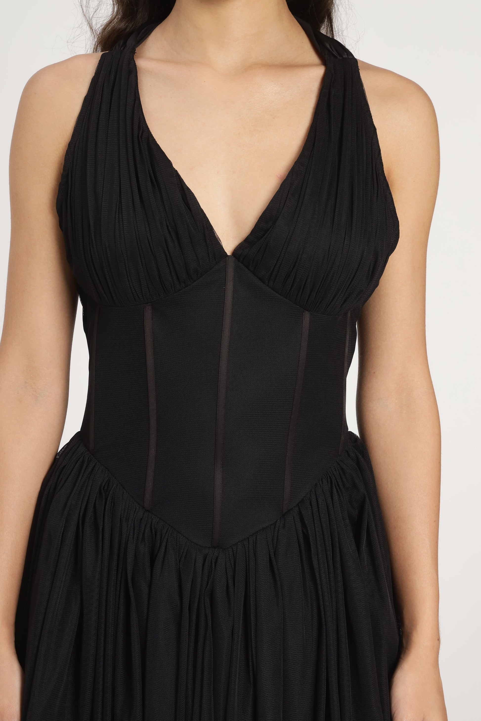 Lace & Beads Therma Mini Dress in Black. Make a bold statement with this stunning black mesh halter mini dress. Featuring a sleek halter neckline, the dress ties gracefully at the nape with a delicate bow, adding a touch of charm to its edgy silhouette. Perfect for nights out or special occasions, the lightweight mesh fabric offers both comfort and allure. Pair it with strappy heels and minimal accessories for an effortlessly chic look.