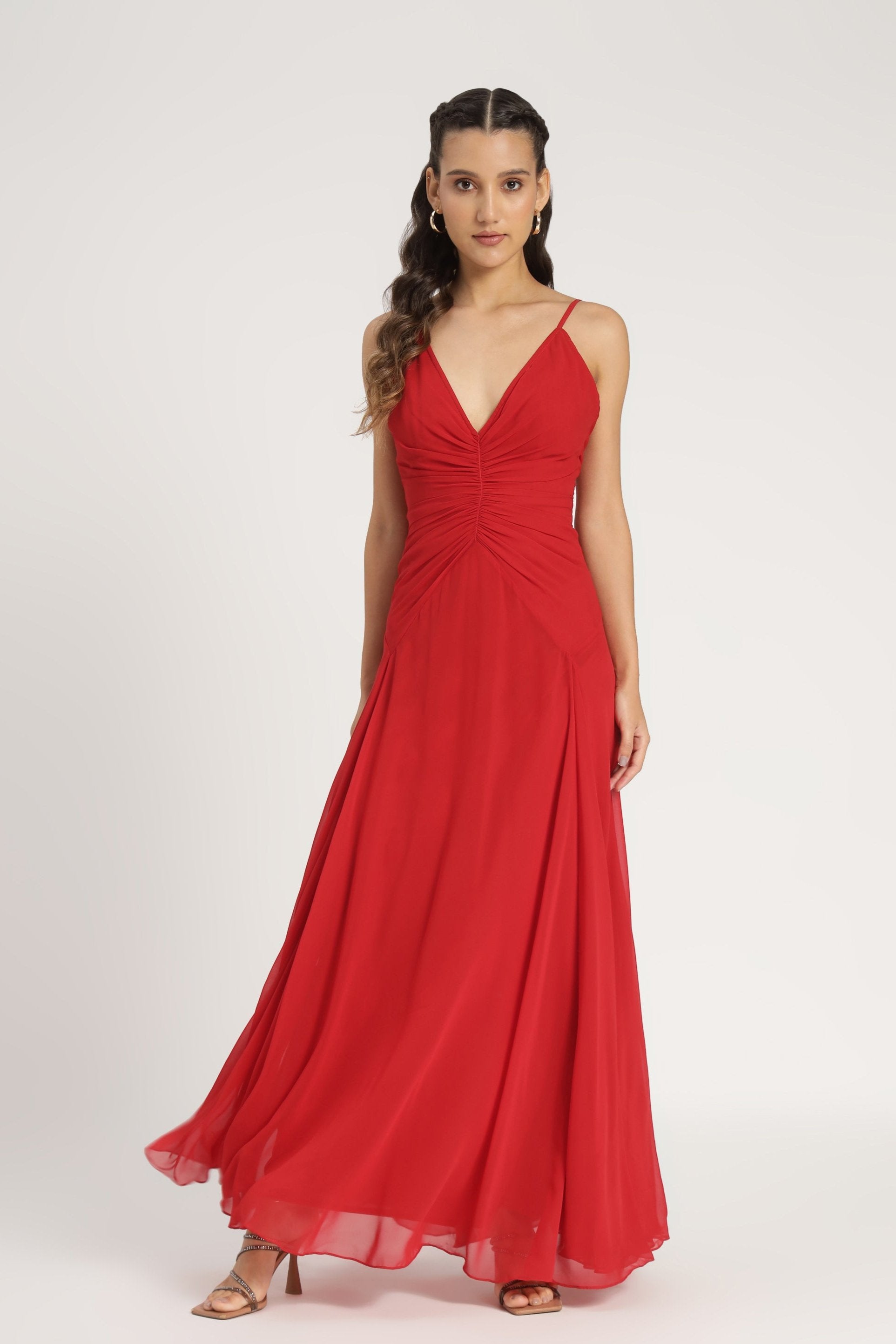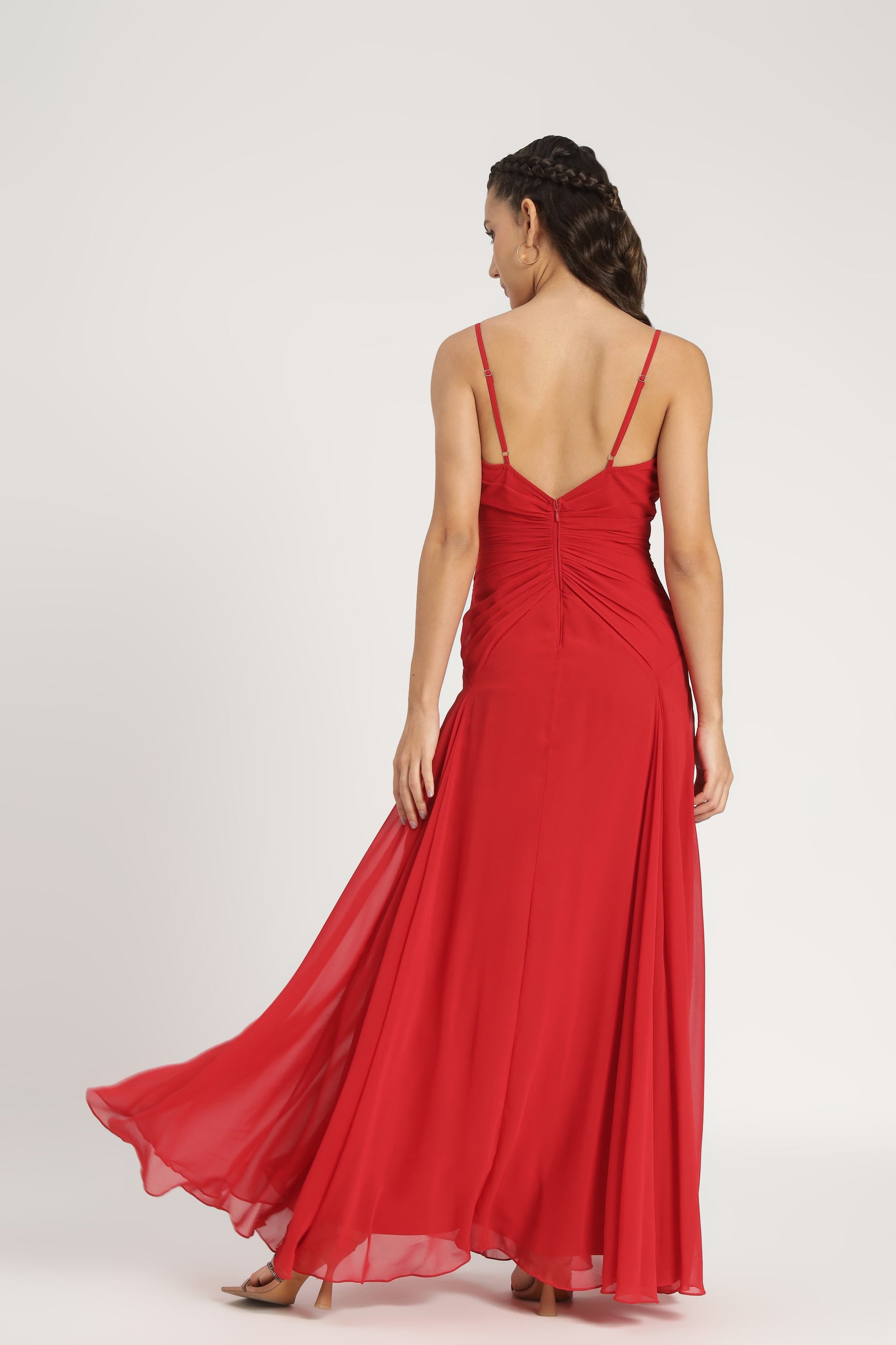 The plunge neckline and flattering pleated bodice flows into a swishing godet skirt. The vibrant red is both daring and romantic, ensuring you’ll stand out with confidence. Pair it with neutral heels and dainty accessories to complete this head-turning ensemble.